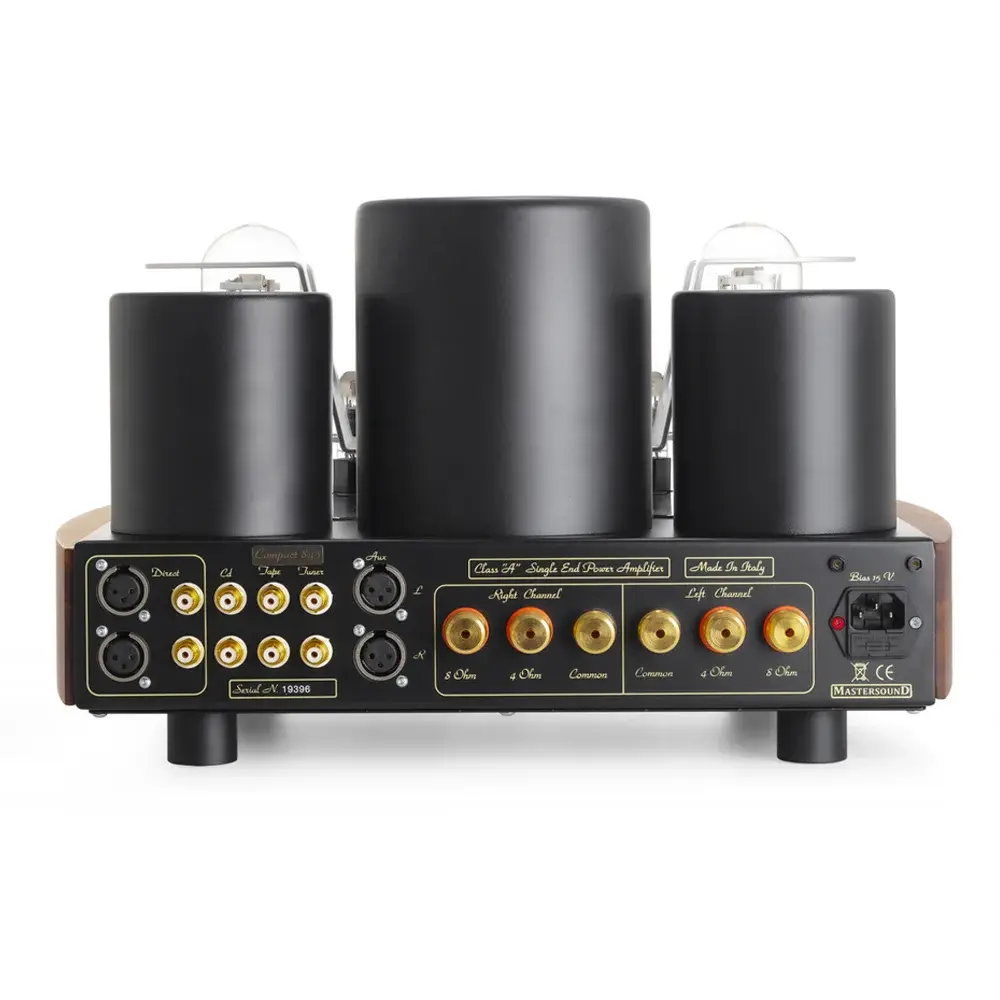 Как и все усилители итальянской компании MastersounD, интегрированный усилитель Compact 845 работает в чистом классе A. В его схеме использованы аудиофильские лампы – две ECC802, две 6SN7 GT и две 845, а все соединения сделаны вручную на собственной фабрике. Для стабильной работы всех ламп разработана оригинальная схема автоматической установки смещения.