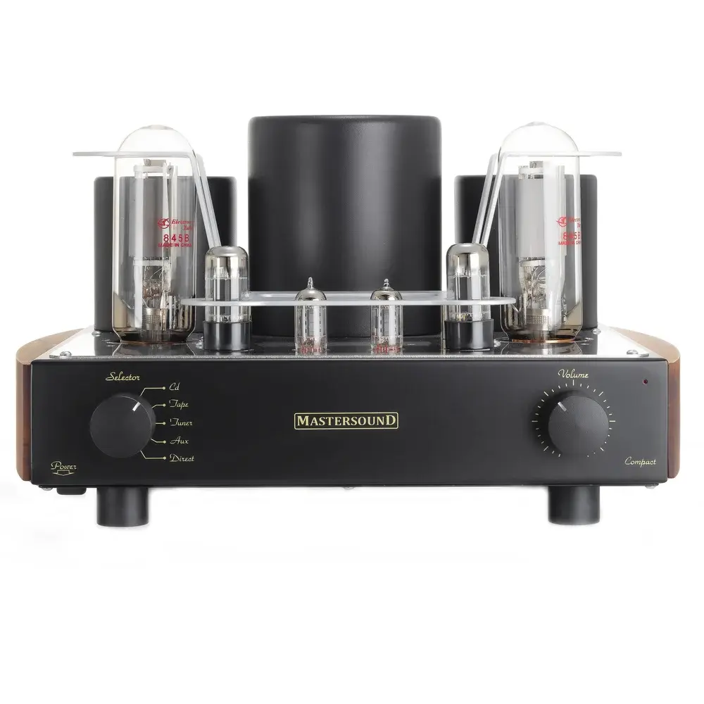 MastersounD Compact 845 — это интегральный ламповый усилитель высшего класса с пультом ДУ. Его выходная мощность составляет 2 х 30 Вт. У него 3 линейных входа на RCA и один на XLR с позолоченными разъёмами.