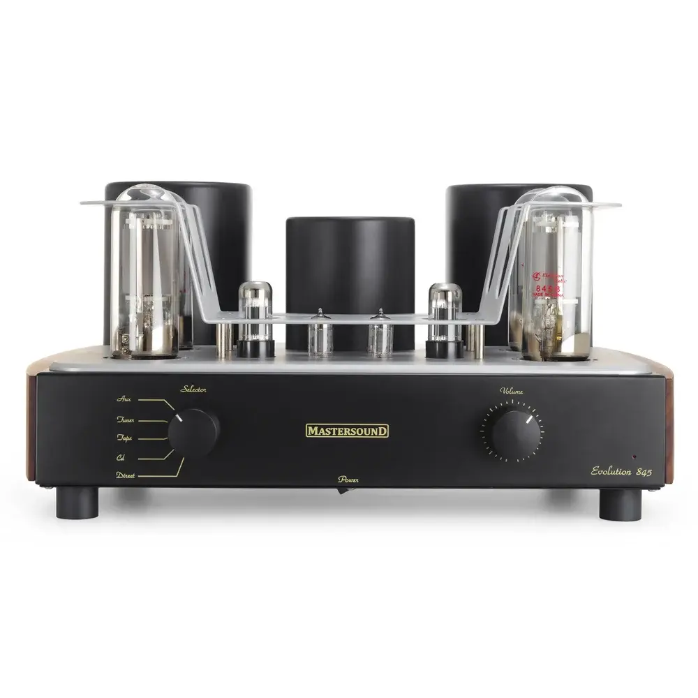 Mastersound Evolution 845 – ламповый однотактный интегральный усилитель 2 х 55 Вт, работающий в классе А. Лампы 2 х ЕСС802, 2 х 6SN7, 4 х 845. Функция автоматического смещения Automatic Bias. Усилитель оборудован входами XLR входы, поставляется с пультом ДУ.