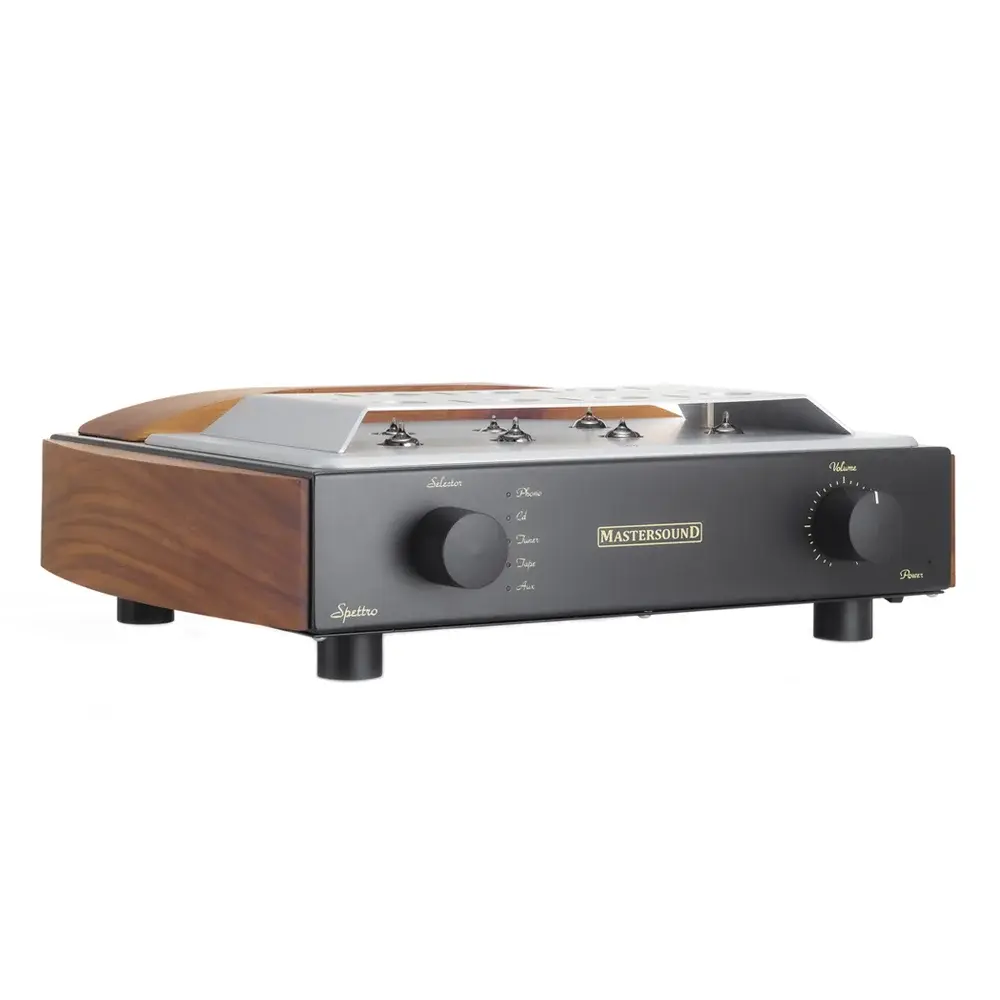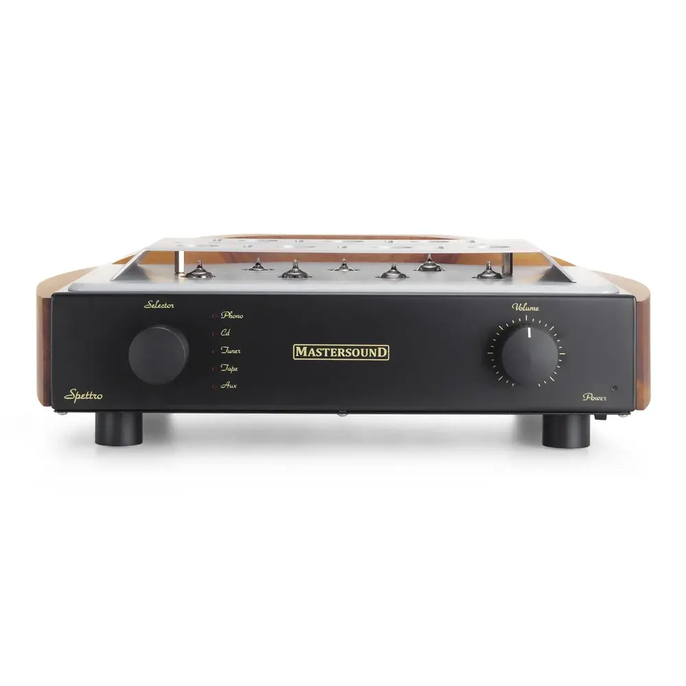 Mastersound Spettro – ламповый предварительный усилитель высшего класса со встроенным фонокорректором и пультом ДУ. Он поддерживает форму кривой эквализации RIAA с точностью +/- 0.5 дБ и кроме входа Phono MM имеет еще 4 линейных входа на RCA, плюс еще один на XLR с позолоченными разъёмами.