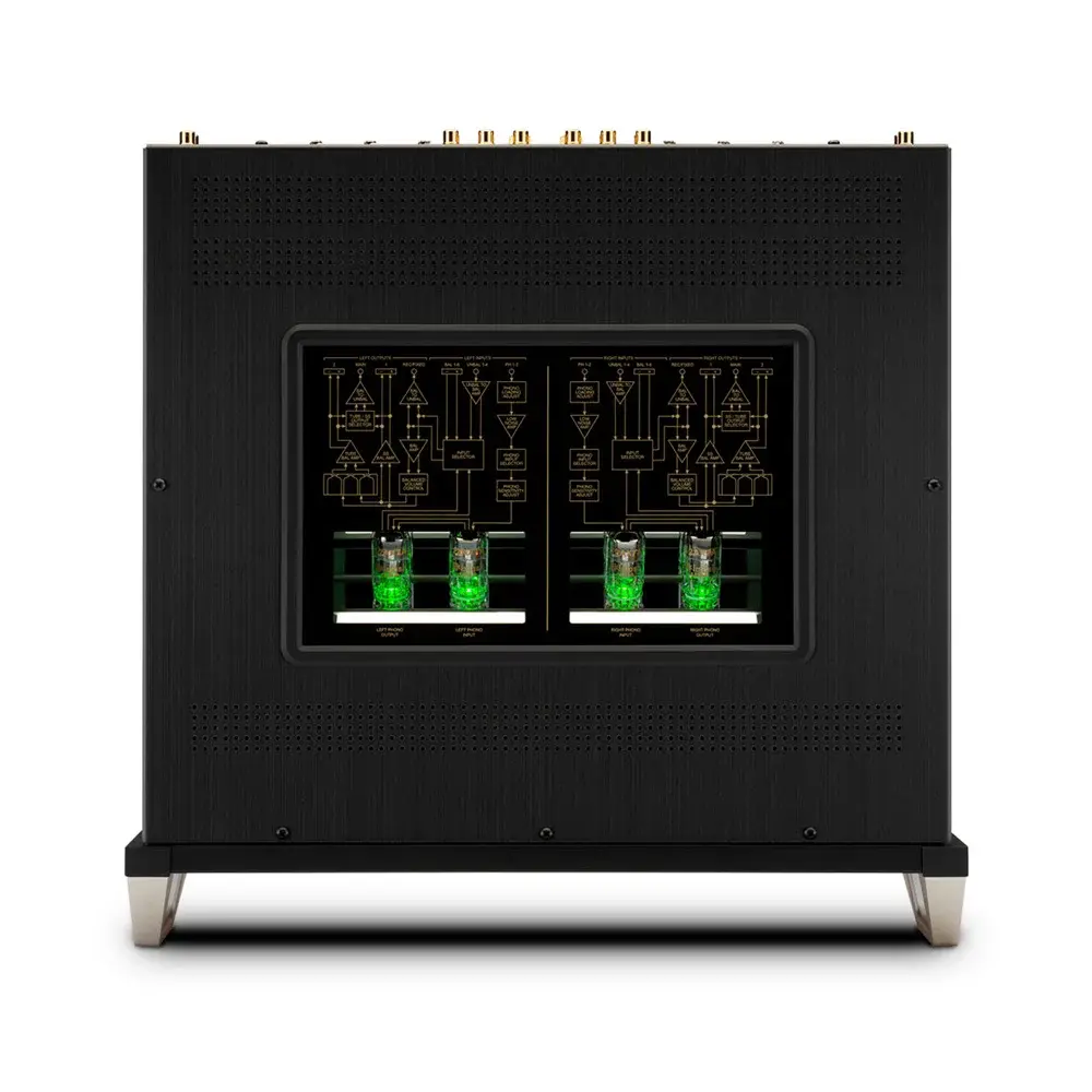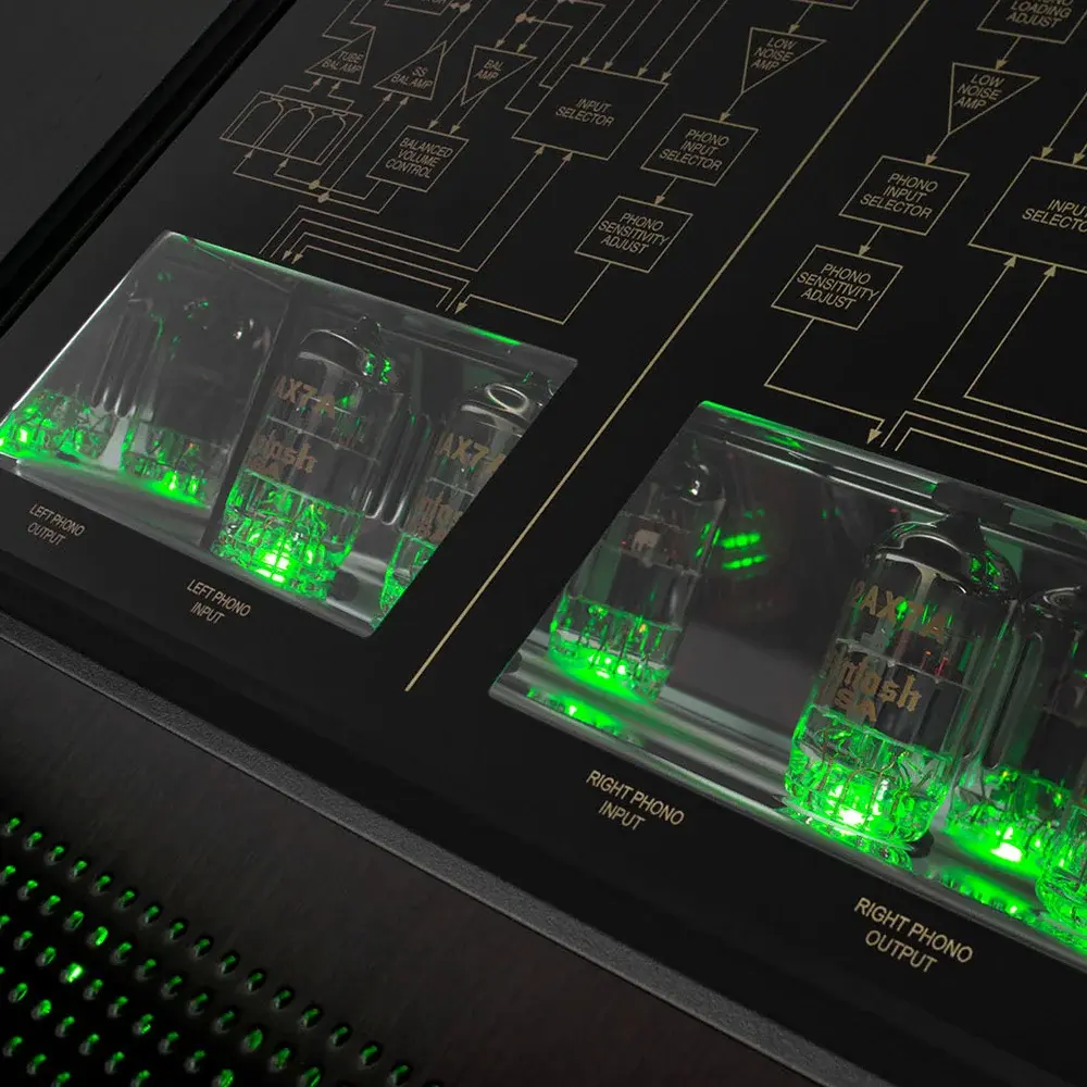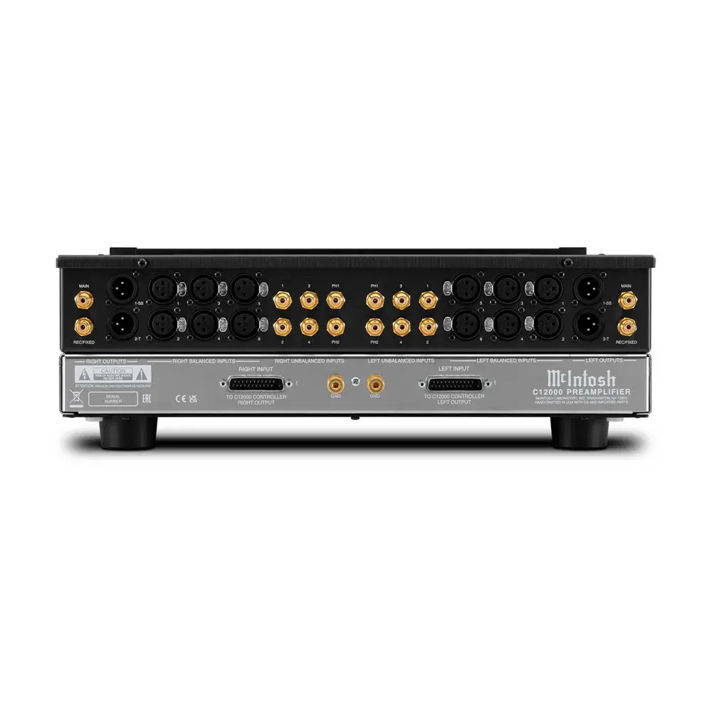 Модуль предусилителя C12000 имеет как ламповый, так и транзисторный выходной каскад, предоставляя пользователю выбирать характер звучания исходя из личных предпочтений. В ламповой секции McIntosh C12000 установлены двойные триоды 12AT7 и 12AX7A, а твердотельный выход реализован через дискретный симметричный операционный усилитель.