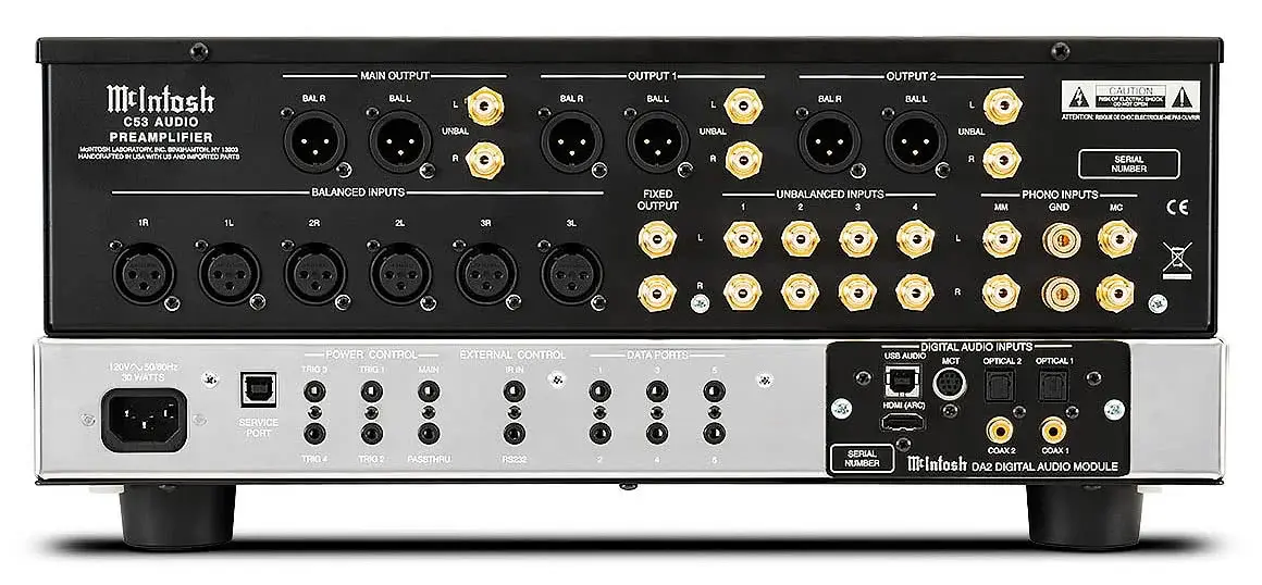 В дополнение к 7 цифровым входам, присутствующим в модуле DA2, C53 также имеет 9 аналоговых входов, что дает почти неисчерпаемое количество из 16 общих входов для подключения всех ваших музыкальных источников. Аналоговые входы состоят из 3 симметричных и 4 несимметричных подключений, а также 1 подвижной катушки и 1 фоновхода с подвижным магнитом для подключения к вашему надежному проигрывателю. Выходы включают 3 переменные симметричные и несбалансированные соединения вместе с 1 фиксированным несимметричным соединением.