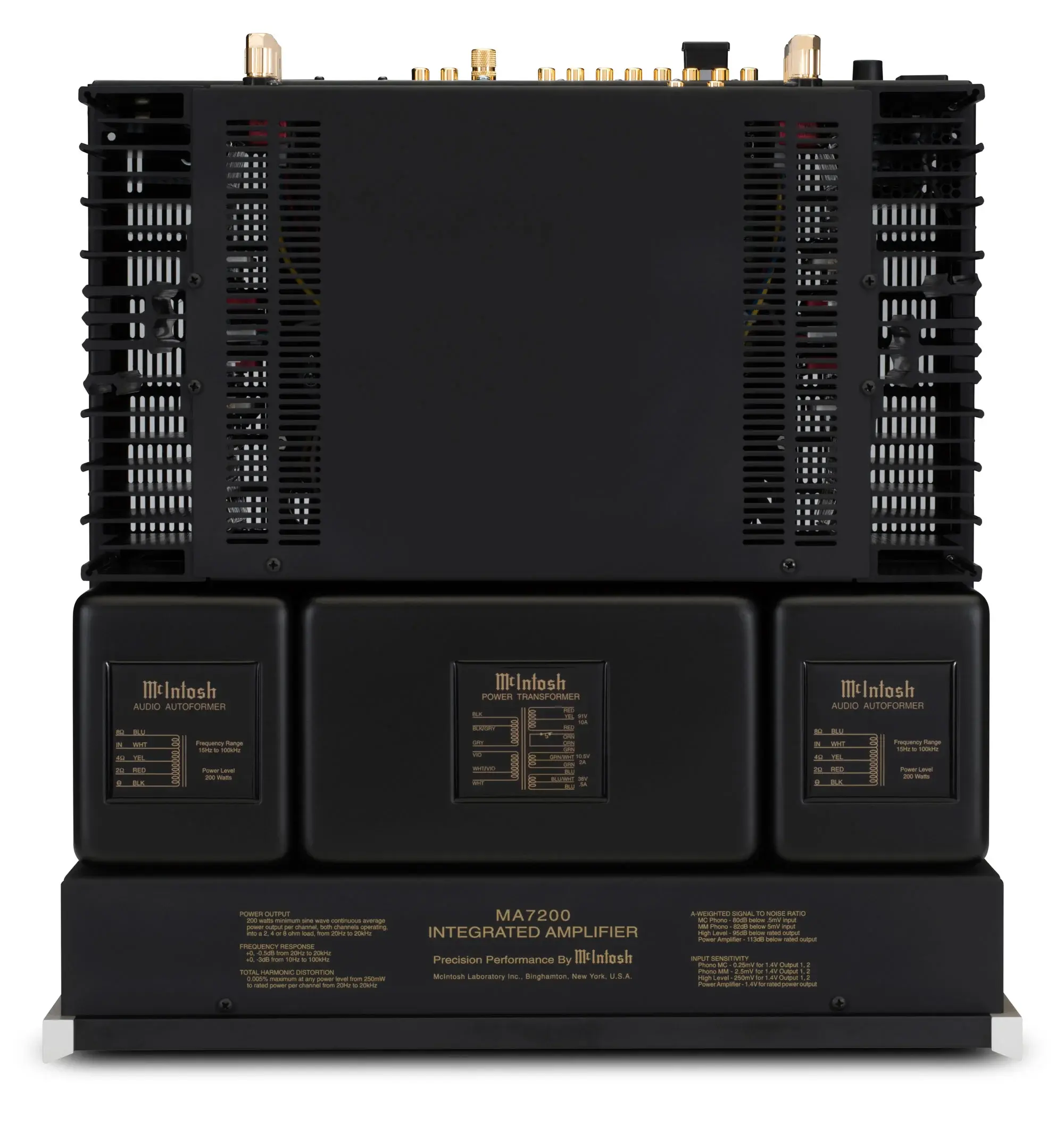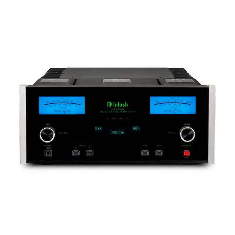 MA7200 оборудован новыми радиаторами Monogrammed Heatsinks которые очень эффективны при рассеивании тепла, часть их выполнена в виде логотипа McIntosh «Mc». Они сопряжены с передовыми транзисторами с высоким током, и отсутствием времени прогрева, поэтому вы можете наслаждаться всеми звуковыми возможностями MCINTOSH MA7200 с момента его включения. MA7200 полон и других технологий McIntosh, включая Autoformers, для доведения до 200 Вт каждого из ваших громкоговорителей независимо от их импеданса, Power Guard, Sentry Monitor, прямого входа PassThru для домашнего кинотеатра, регуляторов низких и высоких частот, технология Crossfeed Director HXD для наушников и позолоченные клеммы и терминалы. Дизайн корпуса отвечает вечному дизайну McIntosh с голубыми стрелочными индикаторами, лицевая панель из черного стекла с алюминиевыми торцевыми крышками, ручками управления и подсветкой логотипа.