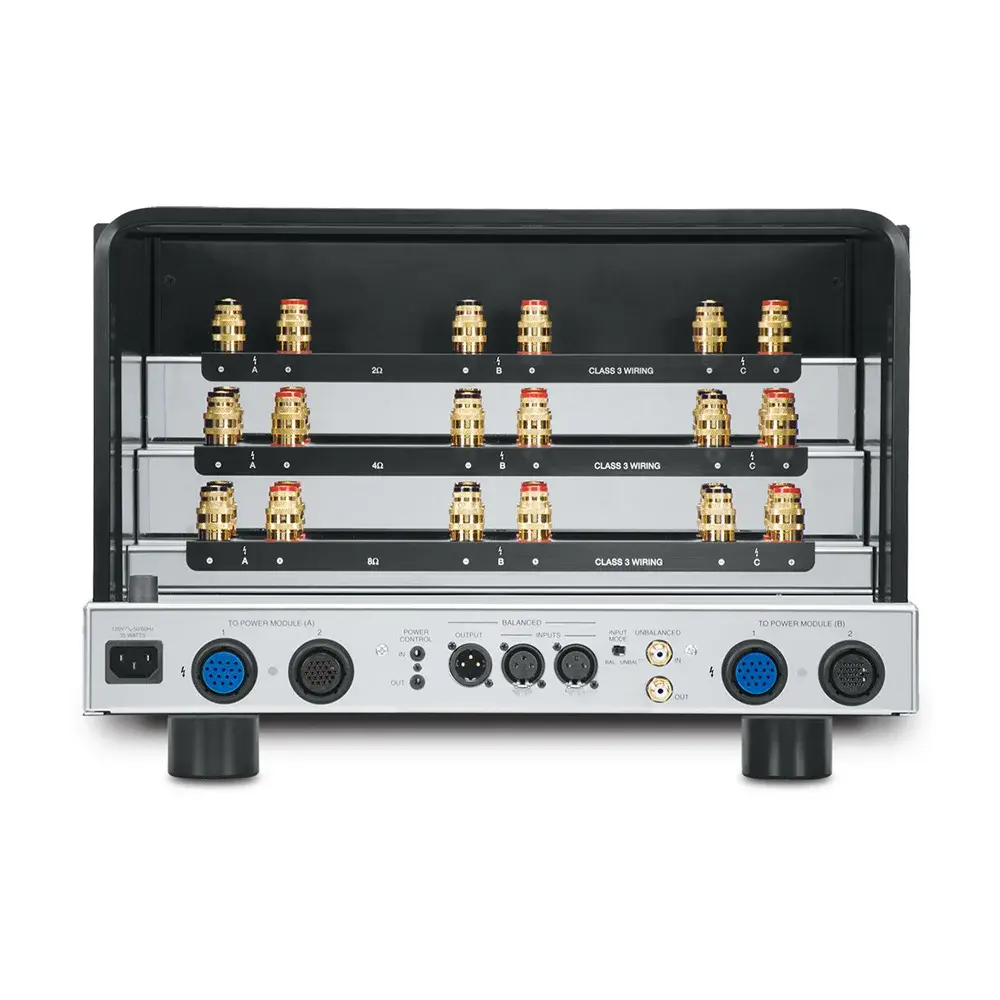 Уникальная конструкция MC2KW состоит из трех модулей, что позволяет отделить питание от выходного сигнала. Каждый 1000-ваттный модуль мощности включает в себя половину балансной схемы с собственным источником питания, что позволяет создать двойную балансную конфигурацию. Выходной модуль содержит входные и выходные разъемы, индикатор уровня и выходной автотрансформатор, и функционирует как центр управления. Сигнал с модулей мощности поступает на выходной трансформатор с зеркальной конструкцией и с двойной обмоткой, где все киловатты мощности суммируются, а шумы и искажения взаимно подавляются.