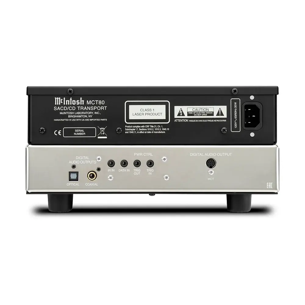 MCT80 имеет улучшенный транспорт с литым под давлением алюминиевым лотком в сочетании с усовершенствованным цифровым сервоприводом для более быстрой, тихой и точной работы. Можно воспроизводить все распространенные типы дисков, включая SACD, CD, CD-R, CD-RW (MP3 и WMA) и созданные пользователем DVD или CD-диски с форматами музыкальных файлов, включая DSD (до DSD128), WAV (до 24- бит / 192 кГц), FLAC, MP3 и другие. Звуковые данные диска считываются с удвоенной нормальной скоростью, гарантируя лучшее отслеживание дорожки, обработку и исправление ошибок. Двойной лазерный оптический датчик обеспечивает оптимальное считывание данных. Цепи управления питанием и передачи данных совместимы с другими компонентами системы McIntosh и объединяют MCT80 в одно рабочее пространство. Он обладает классическим стилем McIntosh с полированным корпусом из нержавеющей стали, лицевой панелью из черного стекла, подсветкой логотипа и алюминиевыми торцевыми крышками.