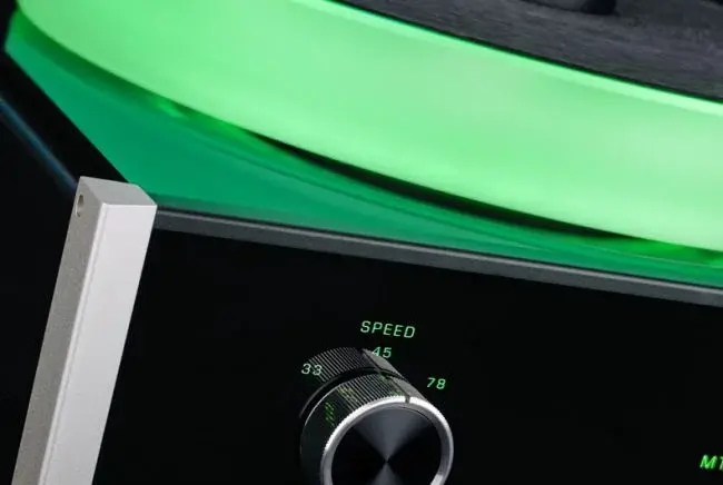 Стеклянная фронтальная панель корпуса оснащена оптоволоконной подсветкой в сочетании с LED-диодами. В ее левой части расположена ручка переключения скоростей вращения (33.3, 45 или 78 об/мин). В правой части находится ручка включения питания/standby.