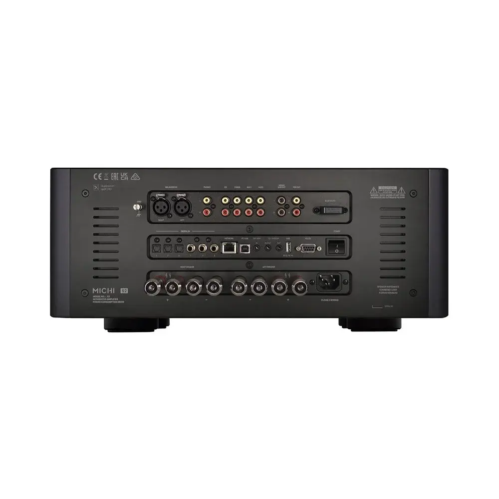 Усилитель X5 Series 2 оснащен множеством функций для бесшовной интеграции в любые аудио системы. На задней панели имеются разъемы для кабельных соединений плюс два комплекта фирменных колоночных клемм Michi с родиевым покрытием, которые обеспечивают беспроблемное подсоединение любых акустических систем, в том числе би-ваерингом. Органы управления и дисплей высокого разрешения на передней панели гарантируют легкость работы и простоту конфигурирования с использованием пульта ДУ Michi. Тороидальный силовой трансформатор собственного производства с большим запасом мощности, высоким КПД и ультра-низким шумом, а также независимые стабилизаторы для изолирования цифровой, аналоговой секций и каскадов усиления мощности, устраняют нежелательные шумы или искажения, помогая улучшить качество звука. Благодаря разъемам RS232 и Ethernet возможна простая интеграция в популярные системы управления, а также обновление программного обеспечения через Интернет или с USB флеш-накопителей.
