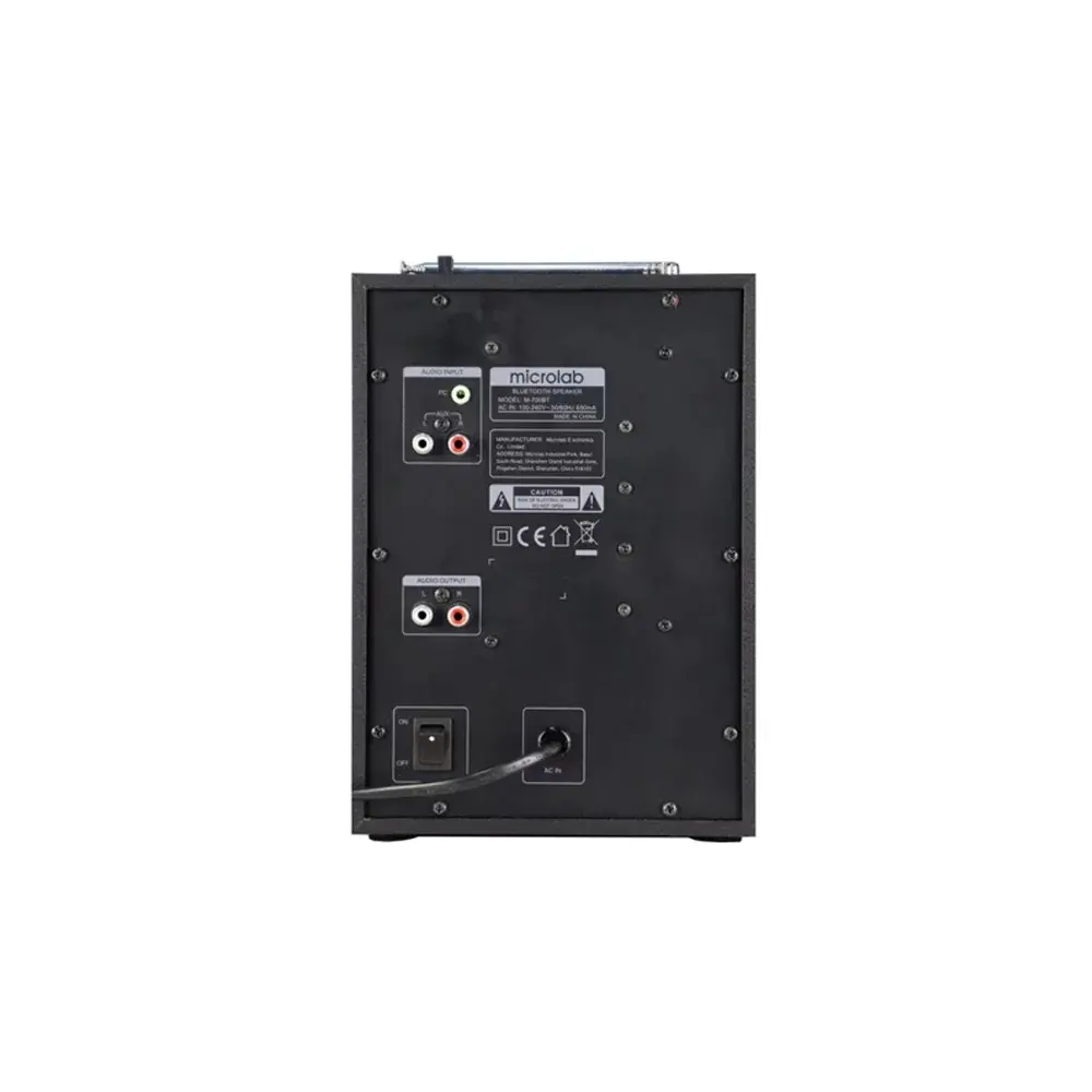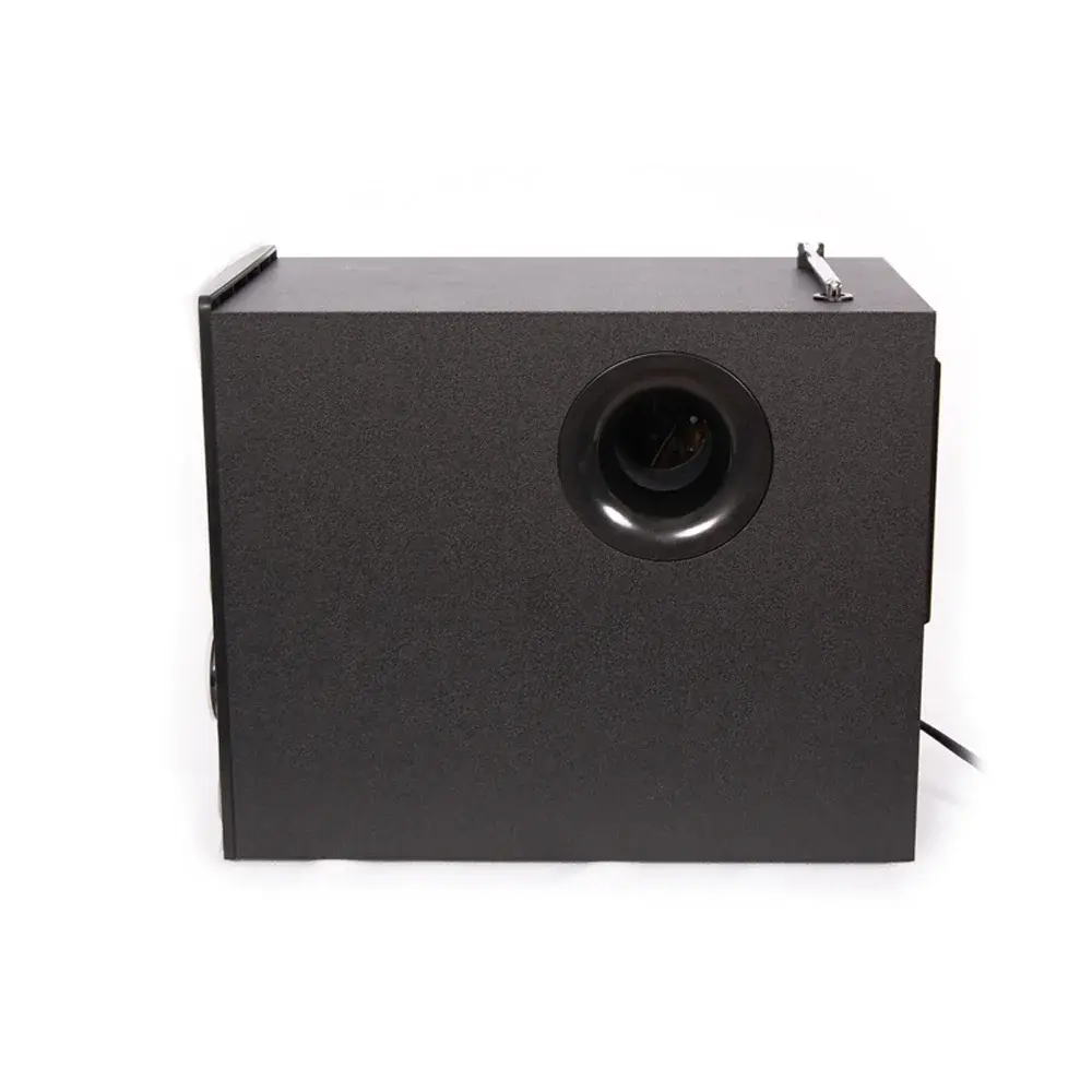 Сабвуфер типа фазоинвертор, с выходом на боковую панель, выполнен из МДФ. На передней панели - регулятор громкости и несколько входных интерфейсов для подключения различных носителей информации (USB и SD), 3,5-мм разъемы и 2RCA, слот для карт SD, а также настройки для встроенного FM-радио.