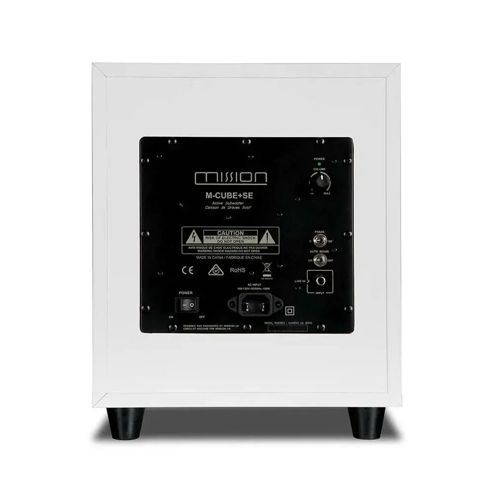Сабвуфер Mission M-CUBE + SE оснащен LFE и линейным стереовходом, который продублирован транзитным выходом. Его наличие позволит подключить еще один сабвуфер «по цепочке», например, в случае необходимости озвучить большое помещение. Сабвуфер оснащен стандартным набором органов управления: регуляторами громкости и частоты настройки входного фильтра, а также переключателем абсолютной фазы. Mission M-CUBE + SE оснащен очень полезной функцией автоматического включения при появлении сигнала на входе.