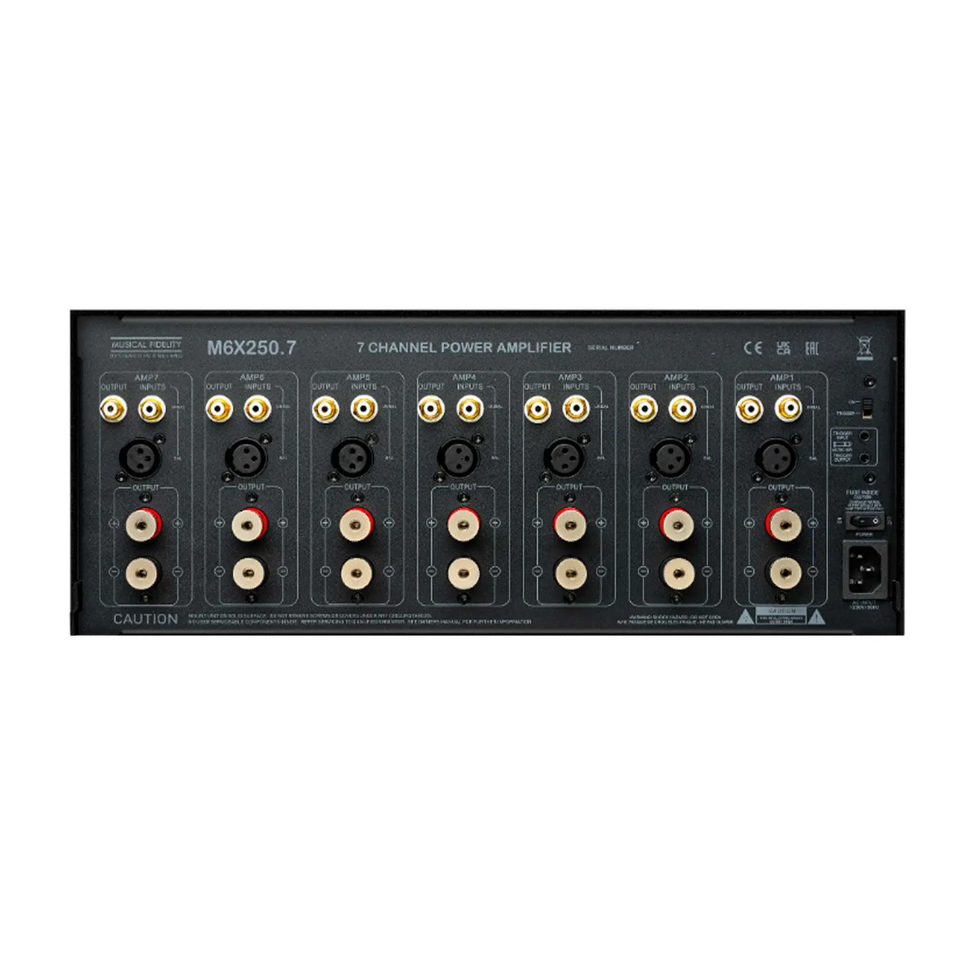 Musical Fidelity M6X 250.7 - это пятиканальный усилитель мощности, имеющий модульную конструкцию. Каждый модуль усилителя выдаёт 250 Вт на нагрузке 4 Ом и работает в классе АВ.