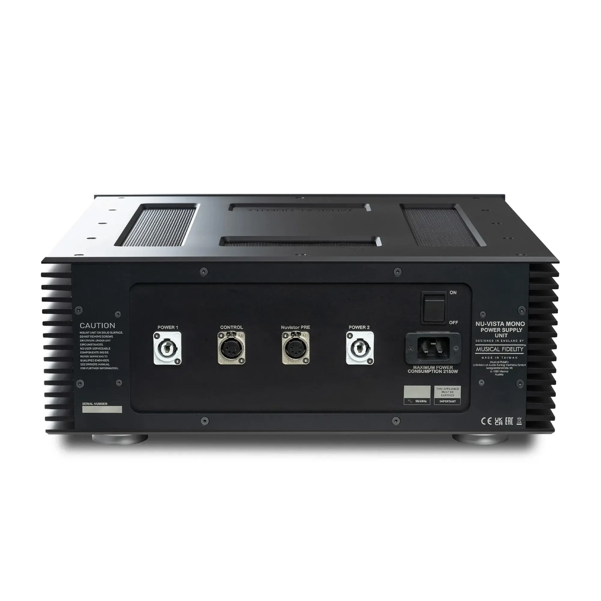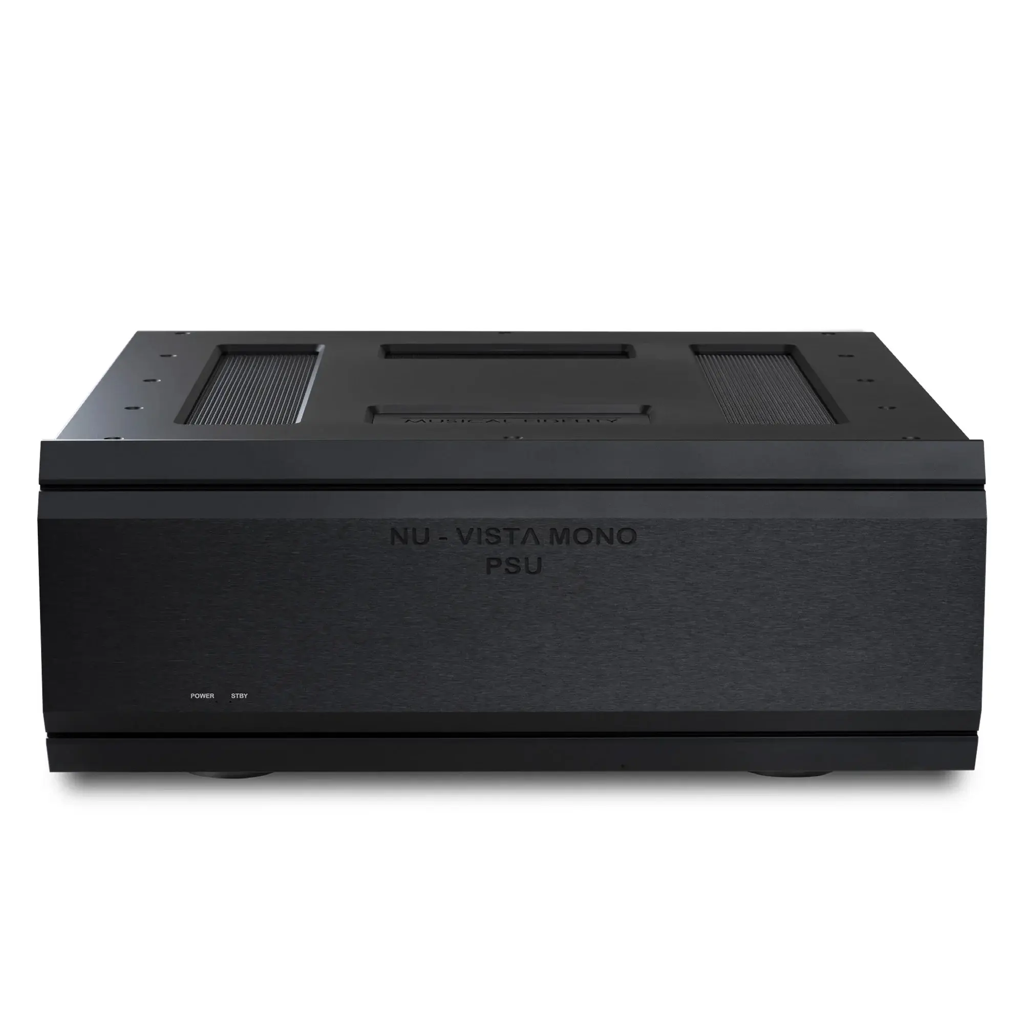 Nu-Vista PAM поставляется с собственным выделенным внешним источником питания. Чтобы добиться лучших шумовых характеристик, инженеры исключили источник питания переменного тока из основного блока и встроили его в отдельный корпус. В этом блоке воспользовались дополнительным пространством для установки встроенной сетевой и выходной фильтрации. Это снижает уровень шума в источнике питания и практически исключает попадание сетевых помех в чувствительную аудиосхему. Блок питания имеет светодиоды «ВКЛ/Режим ожидания» и управляется с передней панели основного блока. Если требуется полная изоляция от сети, источник питания также имеет задний механический переключатель для полного отключения питания.