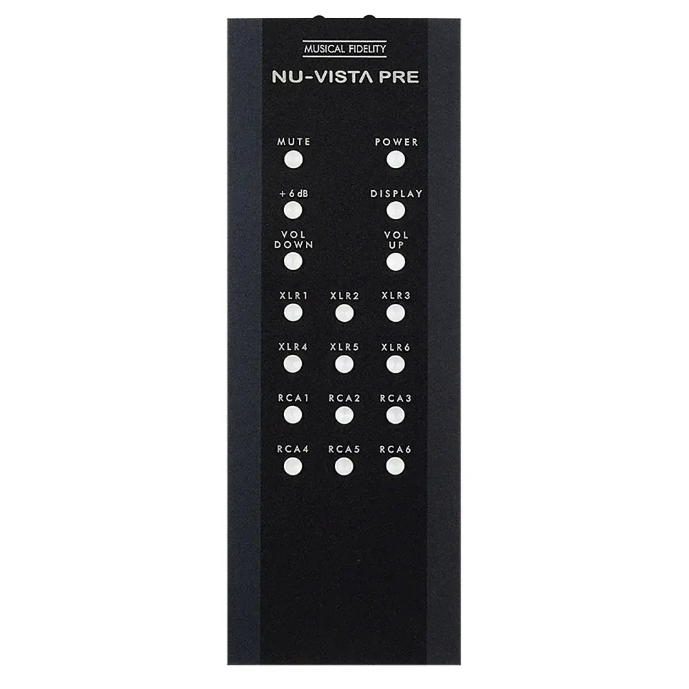 Устройство комплектуются пультом ДУ Nu-Vista, ставшим своеобразным переосмыслением традиционных пультов Musical Fidelity. Материал, из которого он изготовлен, напоминает по текстуре переднюю панель, а его питание осуществляется от легко заменяемых батареек типа ААА. Для упрощения эксплуатации, Nu-Vista PRE оснащён крупным цветным дисплеем, на котором отображаются не только выбранный вход и значения громкости в дБ, но и показания «аналогового» VU-метра.