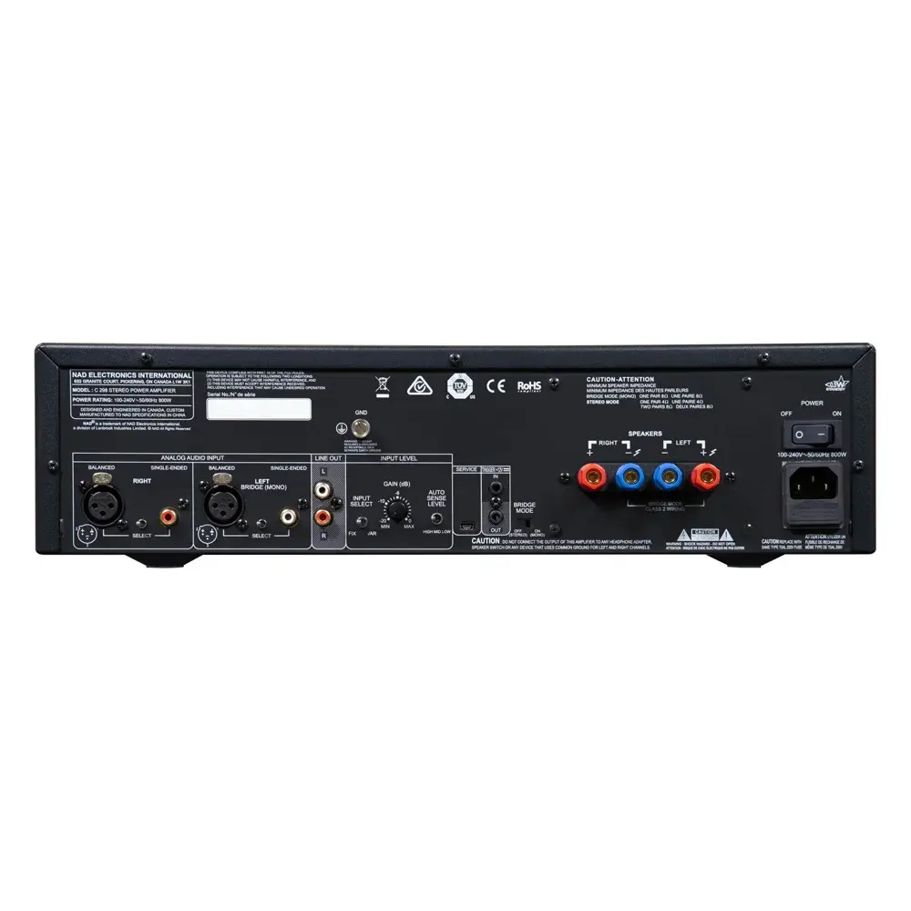 Усилитель мощности NAD C 298 выполнен в металлическом корпусе, а внутреннее расположение элементов в нем обеспечивает свободную циркуляцию воздуха без применения принудительного охлаждения. NAD C 298 оснащен балансными входами (также имеются обычные на разъемах RCA). В усилителе предусмотрено переключение между балансными XLR либо небалансными RCA-входами, оборудованными автоопределением входного сигнала с выбираемым порогом. Кроме того, предусмотрен и линейный выход (только RCA) — можно подключить дополнительные усилители либо активный сабвуфер. Для работы в составе многокомпонентных сетапов будет полезна предусмотренная в NAD C 298 клемма заземления.