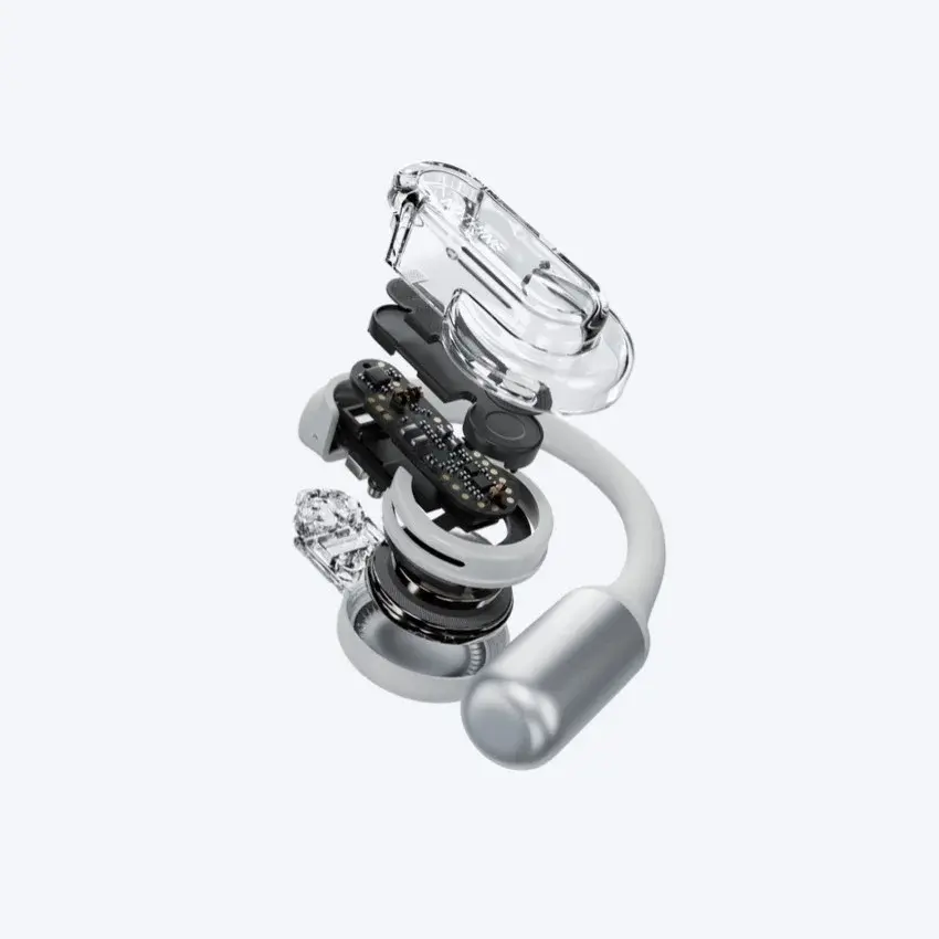 Ear (open) использует уникальную треугольную конструкцию для стабилизации. Заушники созданы из никель-титановой проволоки, что придает им одновременно гибкость и прочность. С весом всего 8,1 г, эти вкладыши обеспечивают надежную и легкую посадку, позволяя вам свободно двигаться — будь то бег, велоспорт или катание на коньках.