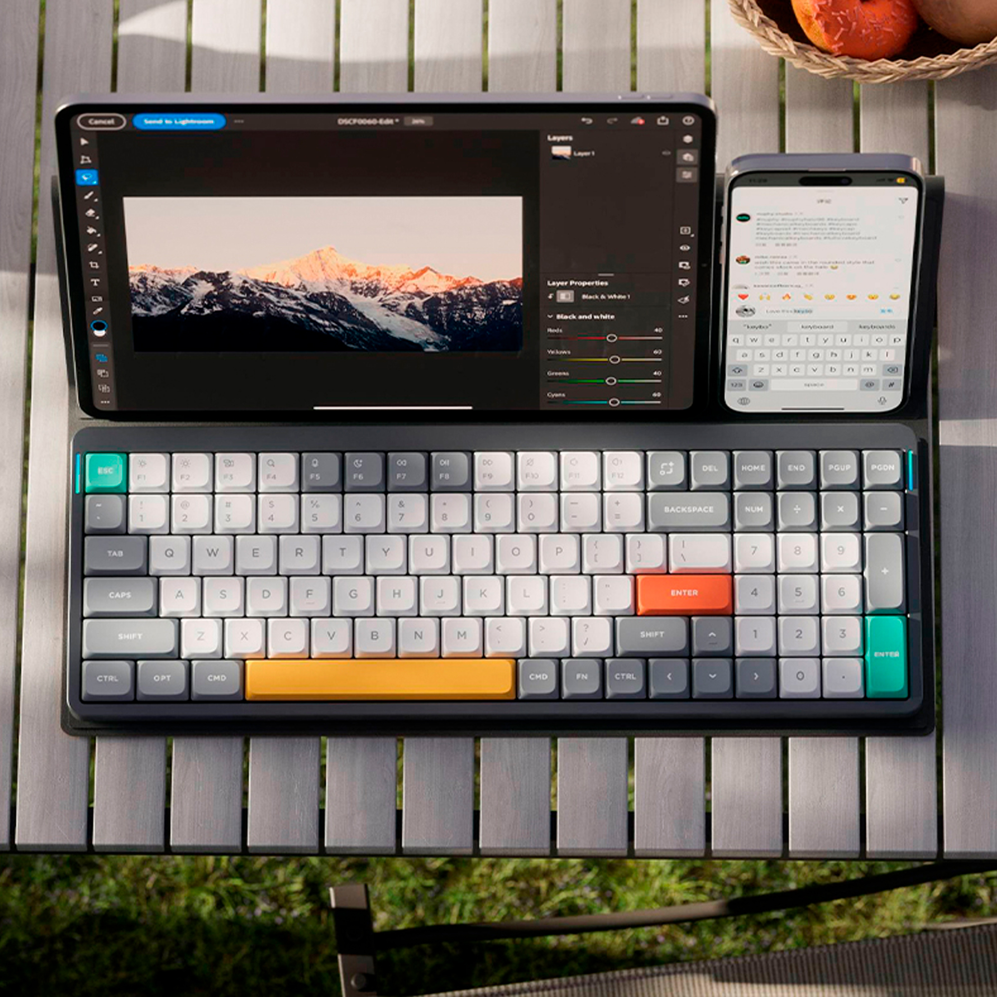NuPhy AIR96 V2 Wireless — это элегантная и мощная механическая клавиатура, которая сочетает в себе ультратонкий дизайн, передовые технологии и премиальную тактильную отдачу. Сверхтонкая алюминиевая рамка, матовая нижняя часть и глянцевая заводская табличка — Air96 v2 сохранили классические элементы дизайна Air. Благодаря компактному 96%-ному формату она сохраняет цифровой блок, но при этом занимает меньше места на столе, чем полноразмерные модели.