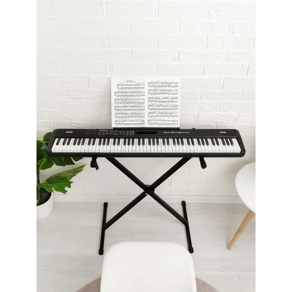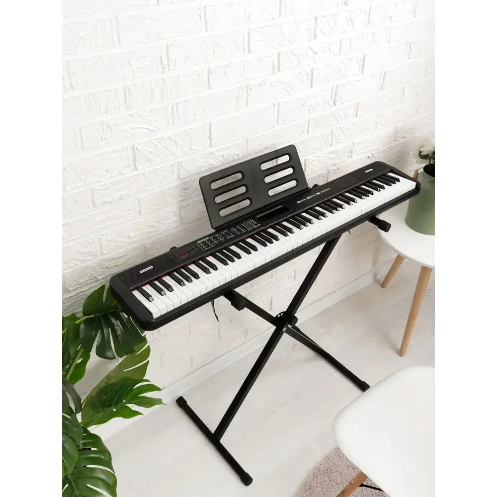 Оснащенное 88 клавишами с активной клавиатурой, устройство обеспечивает максимальную схожесть с настоящим пианино. Размеры клавиш: Белых-ширина 18 мм, длина 110 мм; Черных-ширина 9 мм, длина 65 мм.