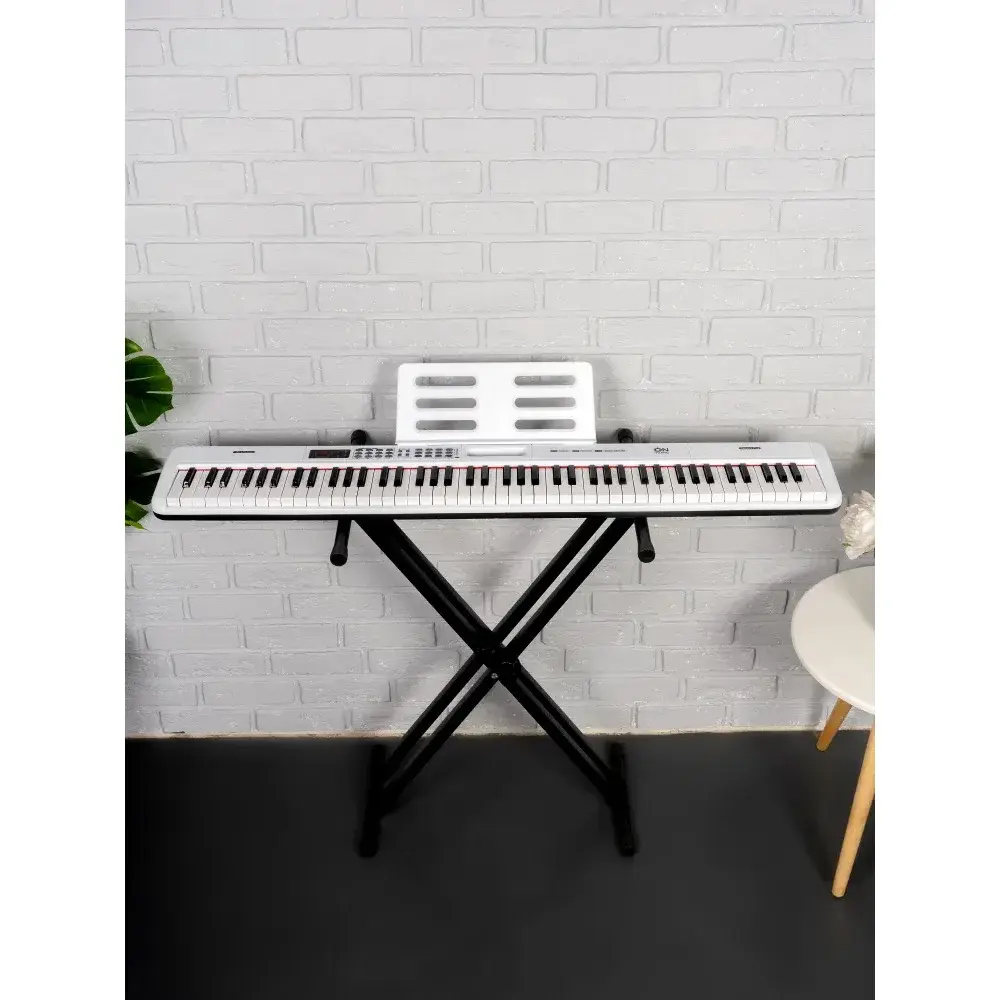 Синтезатор ON music Maestro Plus представляет собой профессиональный музыкальный инструмент с 88 полноразмерными клавишами и полувзвешенной механикой. Модель предоставляет 7 октав, что обеспечивает широкие возможности для игры, а 64-голосная полифония позволяет передавать сложные гармонии и насыщенные музыкальные структуры. В синтезаторе есть 900 тембров, а также 700 стилей автоаккомпанемента, что позволяет адаптировать звук под любые музыкальные жанры и настроения.