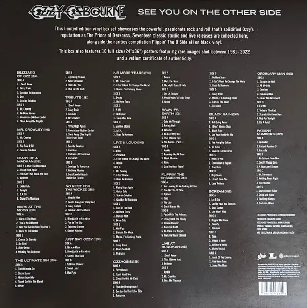 Полное собрание оригинального сольного материала Оззи Осборна в лимитированном виниловом бокс-сете. See You On The Other Side 2.0 включает 18 альбомов, в том числе сборник раритетов Flippin' The B-Side и новые дополнения Patient Number 9 (стандартная версия обложки альбома) и Ordinary Man. Эта версия бокс-сета не пронумерована и не подписана, но выпущена очень ограниченным тиражом. Оззи Осборн — британский вокалист, один из основателей и участник «золотого состава» группы Black Sabbath. После ухода из Black Sabbath начал сольную карьеру. Во всём мире продано более 75 миллионов его записей и более 30 миллионов в США. Альбомы «Blizzard Of Ozz» и «No More Tears» получили статус квадро-платиновых. 19 октября 2024 Оззи Осборн второй раз был включён в Зал славы рок-н-ролла как сольный исполнитель. В результате была запущена кампания по присвоению Оззи звания почетного гражданина его родного города Бирмингема. Певец сидел на троне на церемонии награждения и выразил свою радость в благодарственной речи: «Я не могу поверить, что я здесь. Я хочу поблагодарить всех, кто проголосовал за включение меня в Зал славы рок-н-ролла за мою сольную работу. Огромное спасибо от всего сердца. Спасибо, спасибо, спасибо».