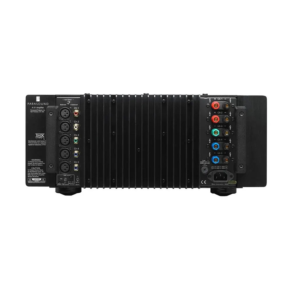 Parasound A51 – 5-канальный усилитель мощности класса A/AB с повышенной нагрузочной способностью, имеющий международную сертификацию THX Ultra 2 и предназначенный для высококачественного усиления аудиосигнала с низкими искажениями в широком частотном диапазоне при работе в составе домашнего кинотеатра или аудиосистемы.