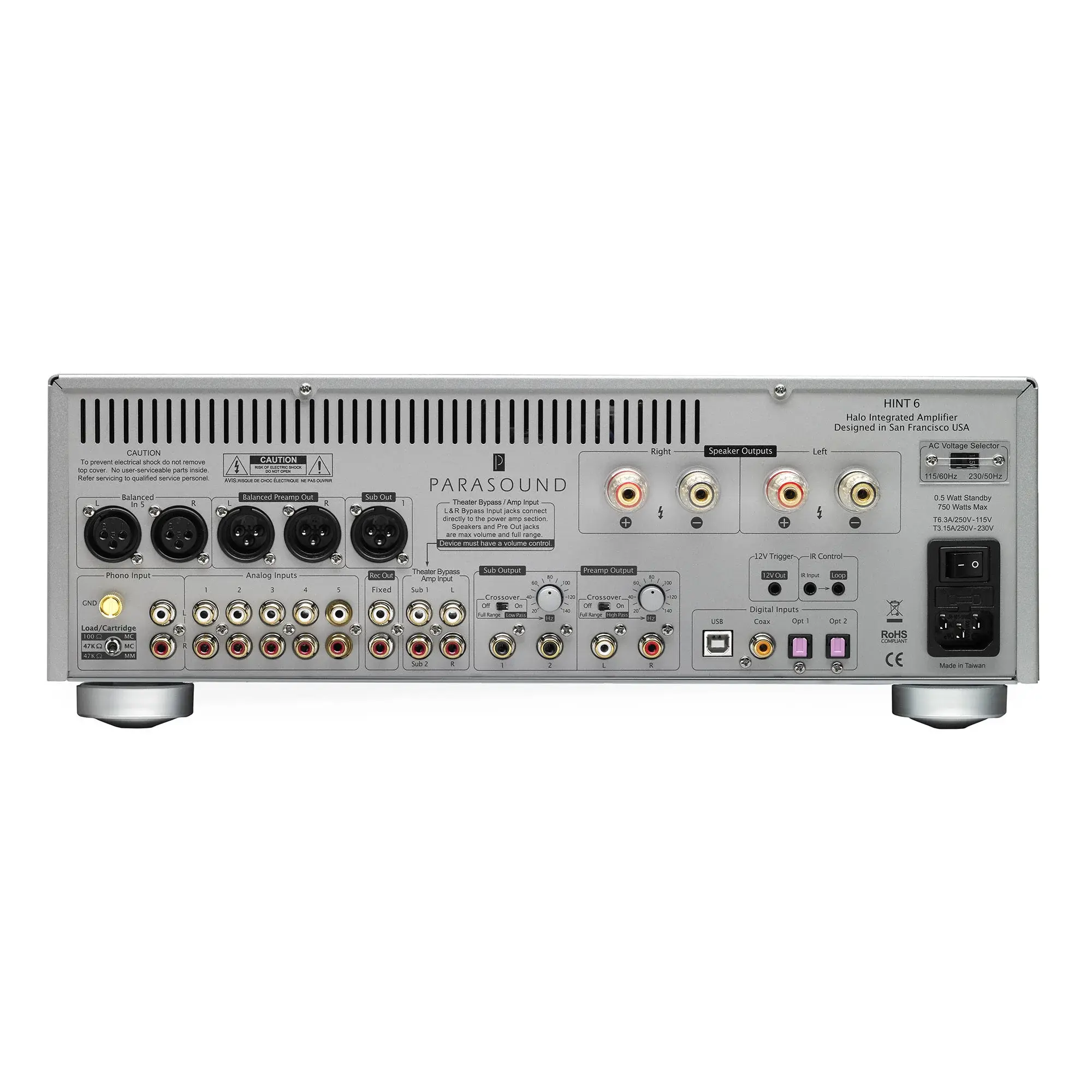 Встроенный ЦАП в Parasound HINT 6 построен на двухканальном конвертере ESS Sabre32 Reference ES9018K2M со схемой подавления джиттера. По асинхронному порту USB 2.0 с новым контроллером Savitech SA9227 он декодирует PCM до 32 бит/384 кГц, а также DSD64, DSD128, DSD256 и DSD через PCM (DoP). По коаксиальному и оптическим (их теперь два) входам принимается сигнал с разрешением до 24/192. Входное сопротивление по входу PHONO задаётся тумблером — 100 Ом для головок MC и 47 кОм для ММ. Помимо винилового проигрывателя, к усилителю можно подключить шесть линейных источников, в т. ч. один по балансному входу. Главных выходов два — на RCA и XLR, максимальная амплитуда на них соответственно 7 и 9 вольт. Выходное сопротивление 10 Ом позволяет особо не задумываться о качестве и длине соединительных кабелей.