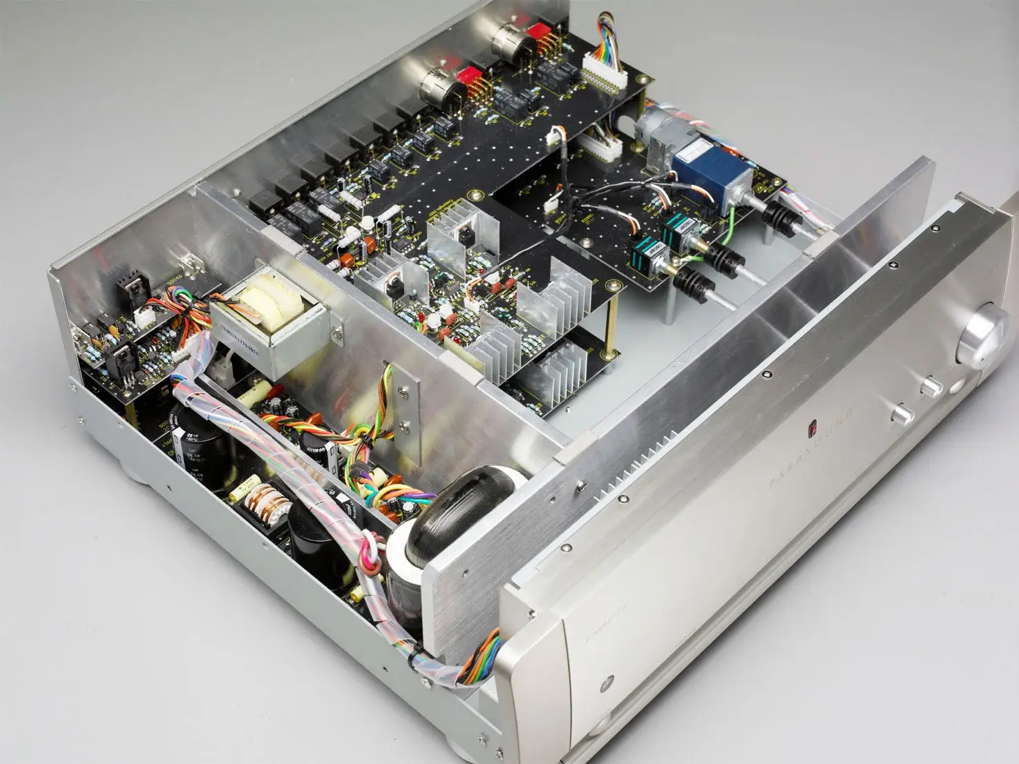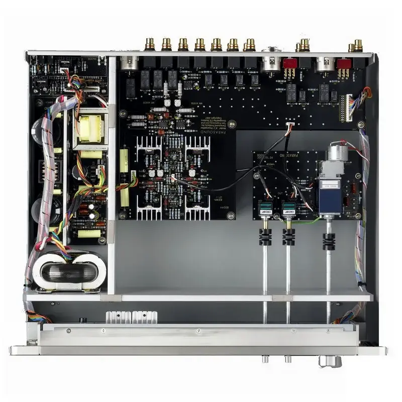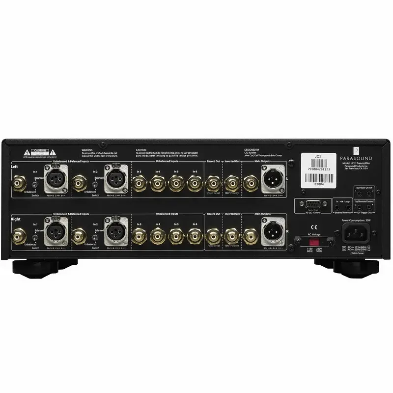 Конструкция стерео предусилителя Parasound JC2 BP реализована по схеме «двойное моно» с применением массивных экранов сантиметровой толщины, что наряду с инновационными конструктивными решениями позволило достигнуть невероятно высокого отношение сигналшум - 116дБ. Отказ от применения стандартного тороидального сетевого трансформатора в пользу трансформатора новой конструкции с сердечником R-типа, исключает собственное излучение помех за счет сложных обмоток балансного типа.
