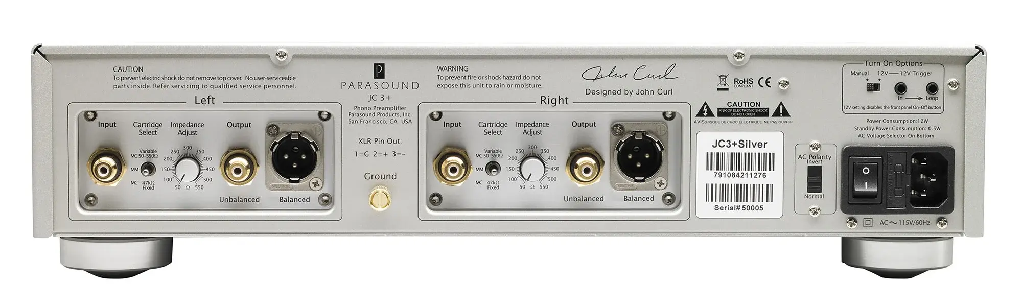 Выход сигнала с фонокорректора на предварительный усилитель возможен при помощи как RCA, так и XLR кабеля. Parasound JC3 имеет переключатель «моно/стерео» на лицевой панели для прослушивания как в стерео, так и в монорежимах (для старых монофонических записей). Корпус фонокорректора разделен внутри толстыми алюминиевыми перегородками, что существенно снижает помехи от электромагнитного поля. Для питания аппарата используется трансформатор R-типа, имеющий гораздо меньшее излучение электромагнитного поля по сравнению с традиционным тороидальным трансформатором.