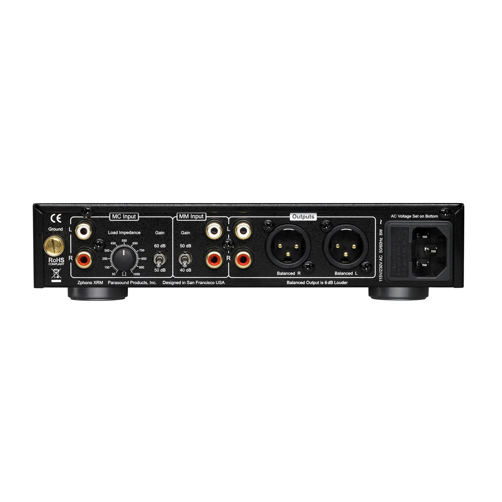 На борту Zphono XRM расположились балансные и небалансные выходы, переключаемый фильтр рокота и переключатель между режимами моно и стерео. Для работы с MM- и MC-картриджами предусмотрены независимые схемы и отдельные входы. Переключатель между MM и MC находится на фронтальной панели, а регулятор нагрузки для MC-головок — на задней. Для MM-картриджей можно выбрать коэффициент усиления 40 или 50 дБ. Блок питания встроенный, линейный.