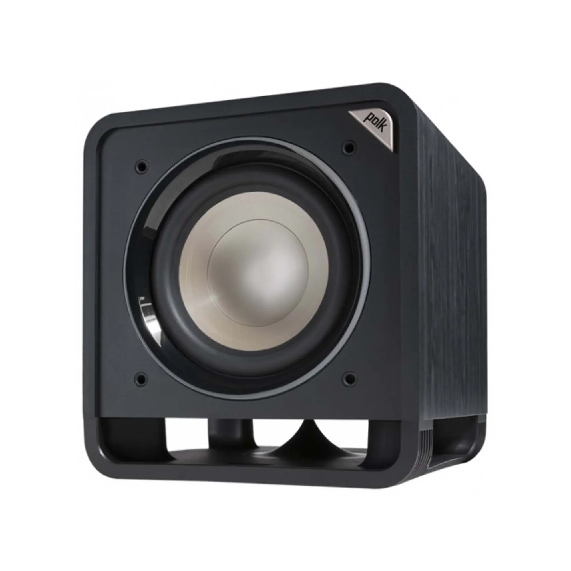 Сабвуфер оснащен фирменным 10-дюймовым низкочастотным динамиком Dynamic Balance. Басовик оснащен полипропиленовым диффузором, а конструкция его магнитной системы оптимизирована методом компьютерного моделирования. НЧ-динамик расположен на передней панели и полностью закрыт съемной защитной сеткой. Она устанавливается вровень с боковыми стенками, благодаря чему Polk Audio HTS SUB 10 выглядит очень аккуратно. Интересным штрихом в дизайне сабвуфера является металлический логотип в углу передней панели, который всегда остается на виду – и когда защитная сетка надета, и без нее.