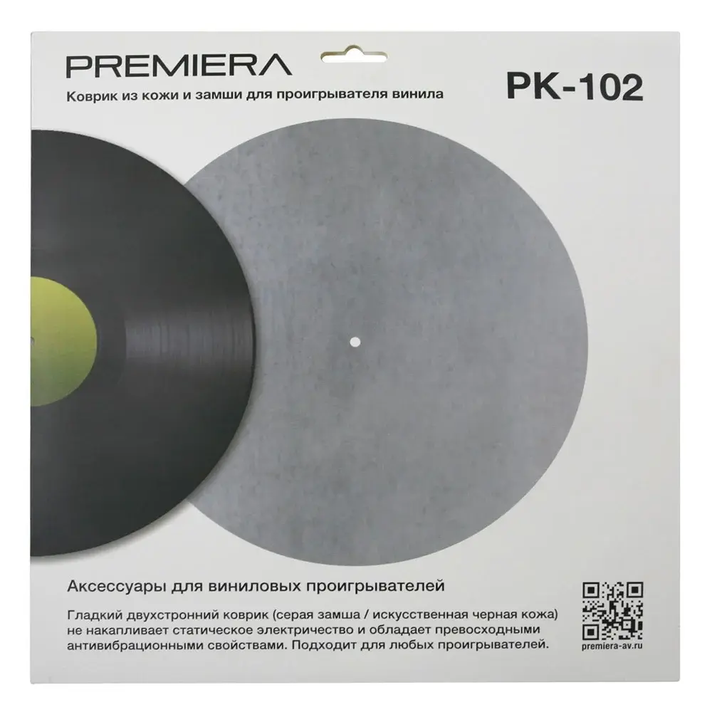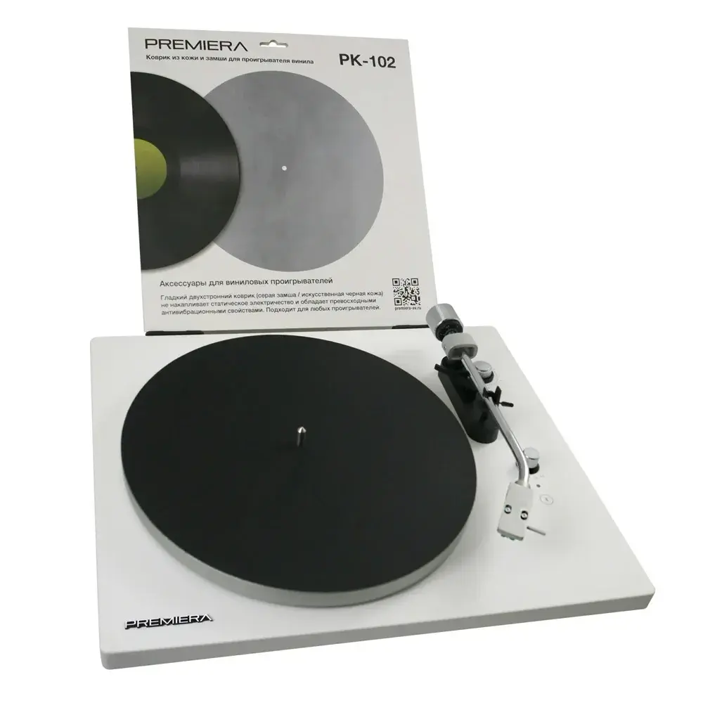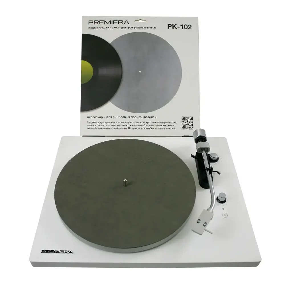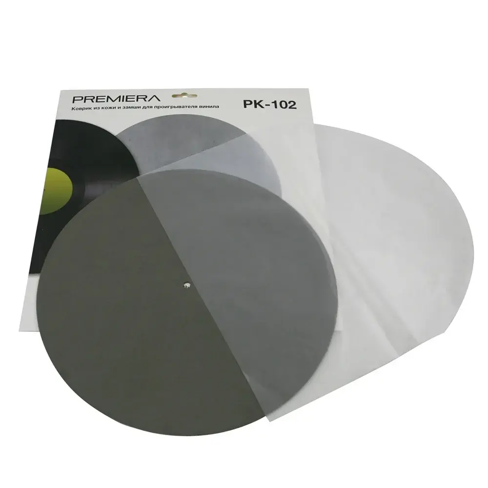 PREMIERA PK-102 - коврик из кожи и замши для проигрывателя винила. Коврик из замши и кожи для винилового проигрывателя — это удобное и стильное дополнение, которое не только прекрасно выглядит, но и способствует улучшению звука и защите ваших виниловых пластинок.