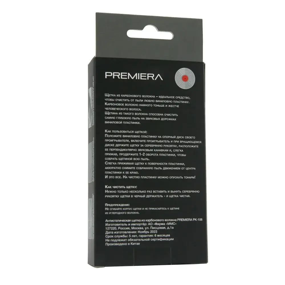 Premiera PK-106 - антистатическая щётка из карбонового волокна. Конечно же можно протирать пластинки тряпкой, но все равно, каждый раз, когда вы достаете их из конверта, из бумажного или целлофанового пакета, вы собираете много пыли из-за статического электричества, которое возникает под воздействием касаний и трения различных материалов.