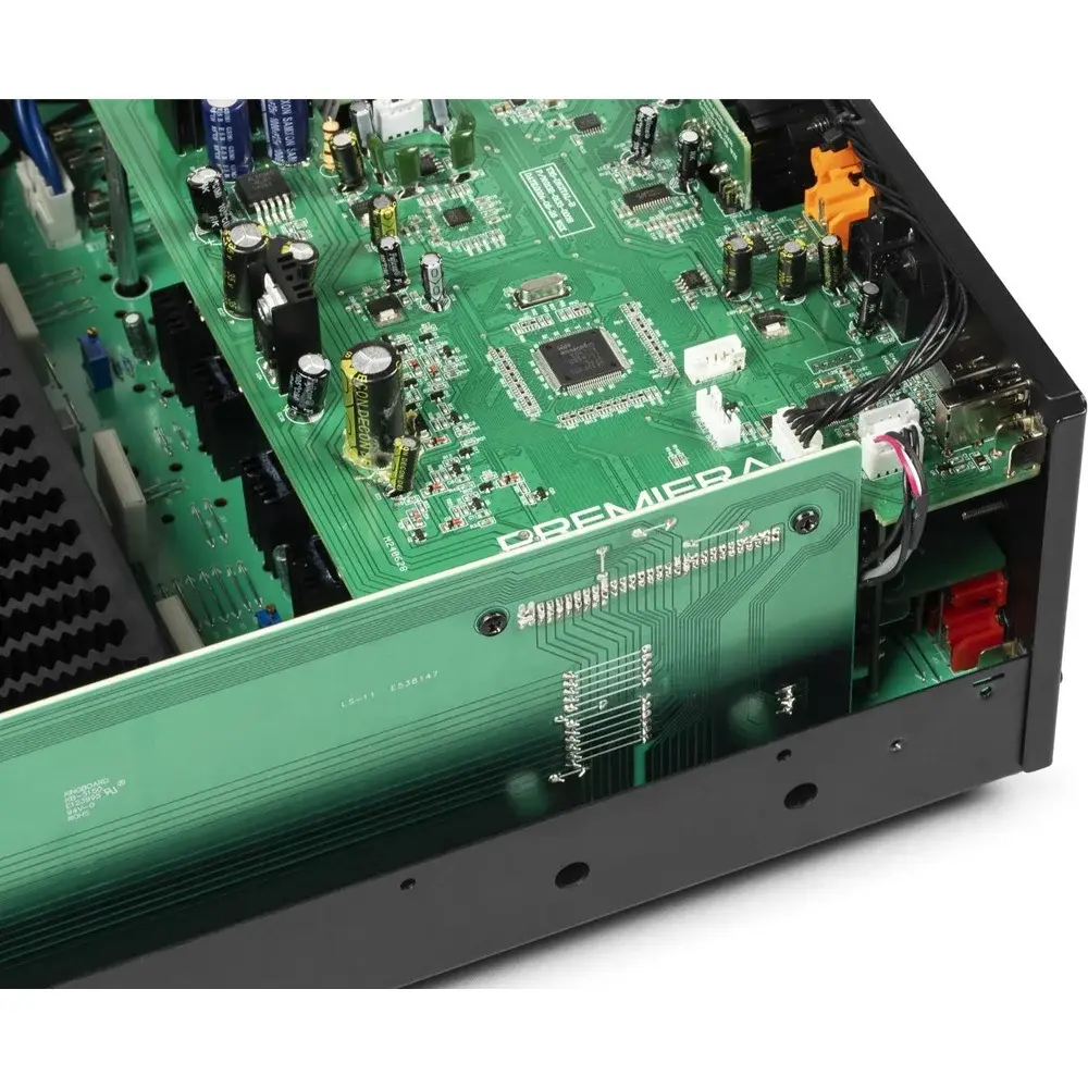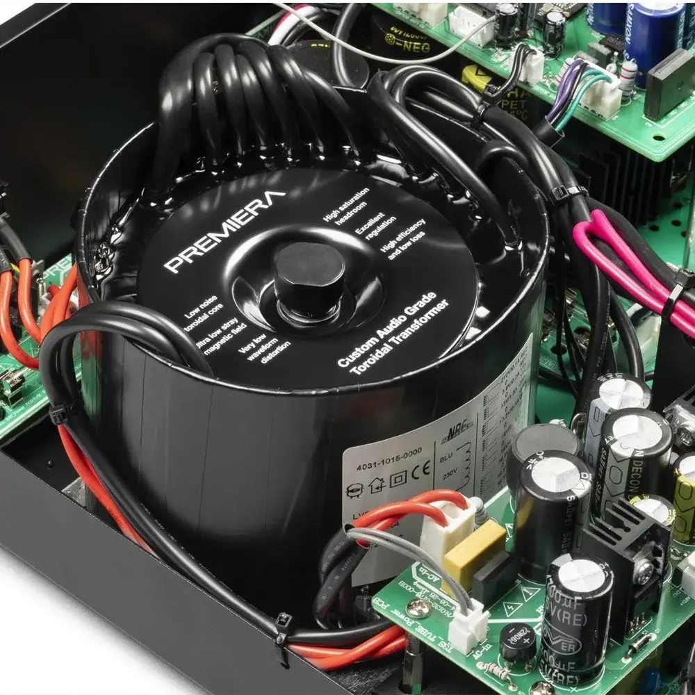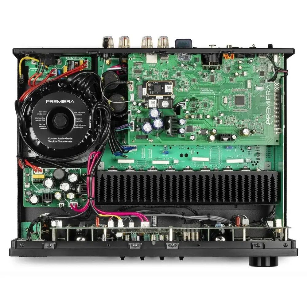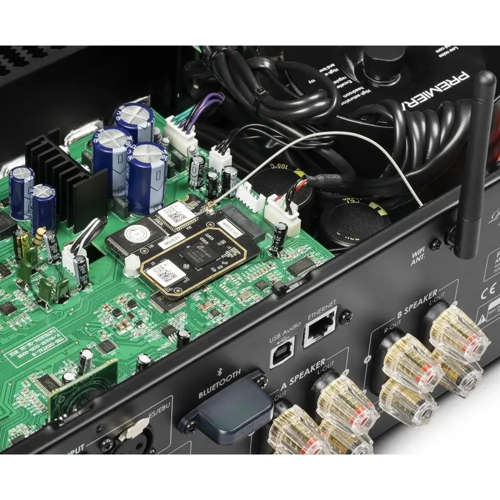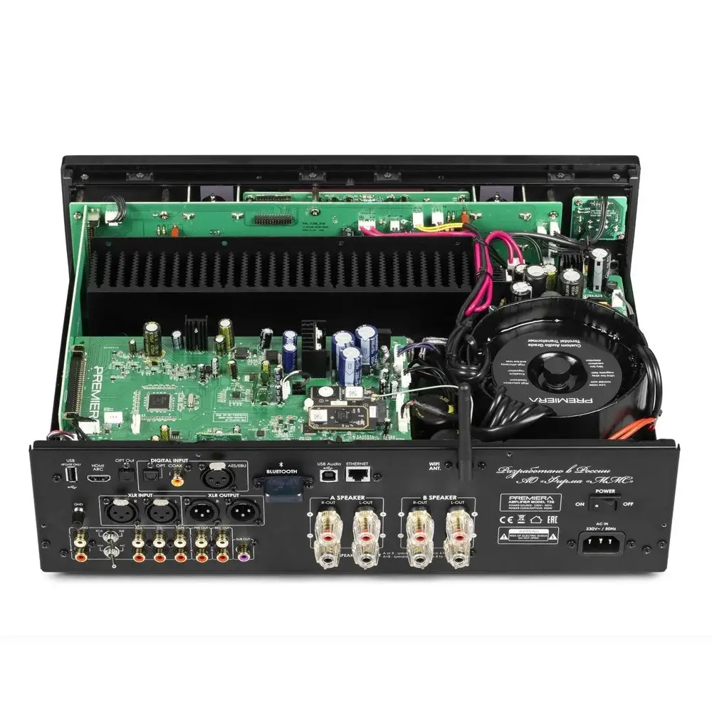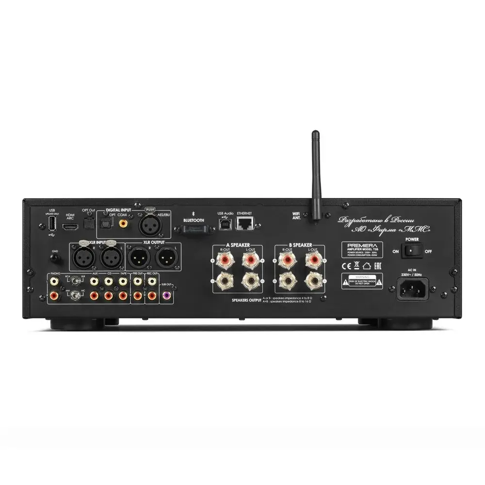 Premiera T3S - современный интегральный Hi-Fi стереоусилитель класса AB с ламповым каскадом предварительного усиления, со встроенными сетевым проигрывателем, MM/MC-фонокорректором, ЦАП, Bluetooth, HDMI ARC, Wi-Fi и AirPlay 2, с номинальной выходной мощностью 115 Вт на канал.