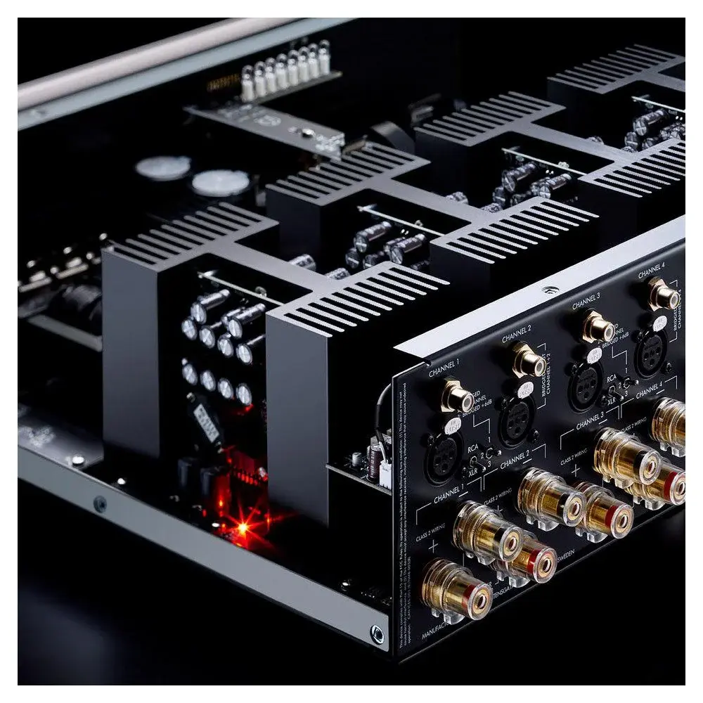 Оригинальная конструкция обеспечивает максимально прямую подачу и равномерное распределение мощности от источника питания к надёжно изолированным усилительным модулям. В свою очередь, входной и выходной каскады изолированы от любого шума, который могут производить модули усилителя. Установка моста возможна для любой пары выходов; достигаемая в результате мощность: 740 Вт / 8 Ом (с ограниченной клиппинг-защитой), 750 Вт / 4 м, 450 Вт / 2 Ом.