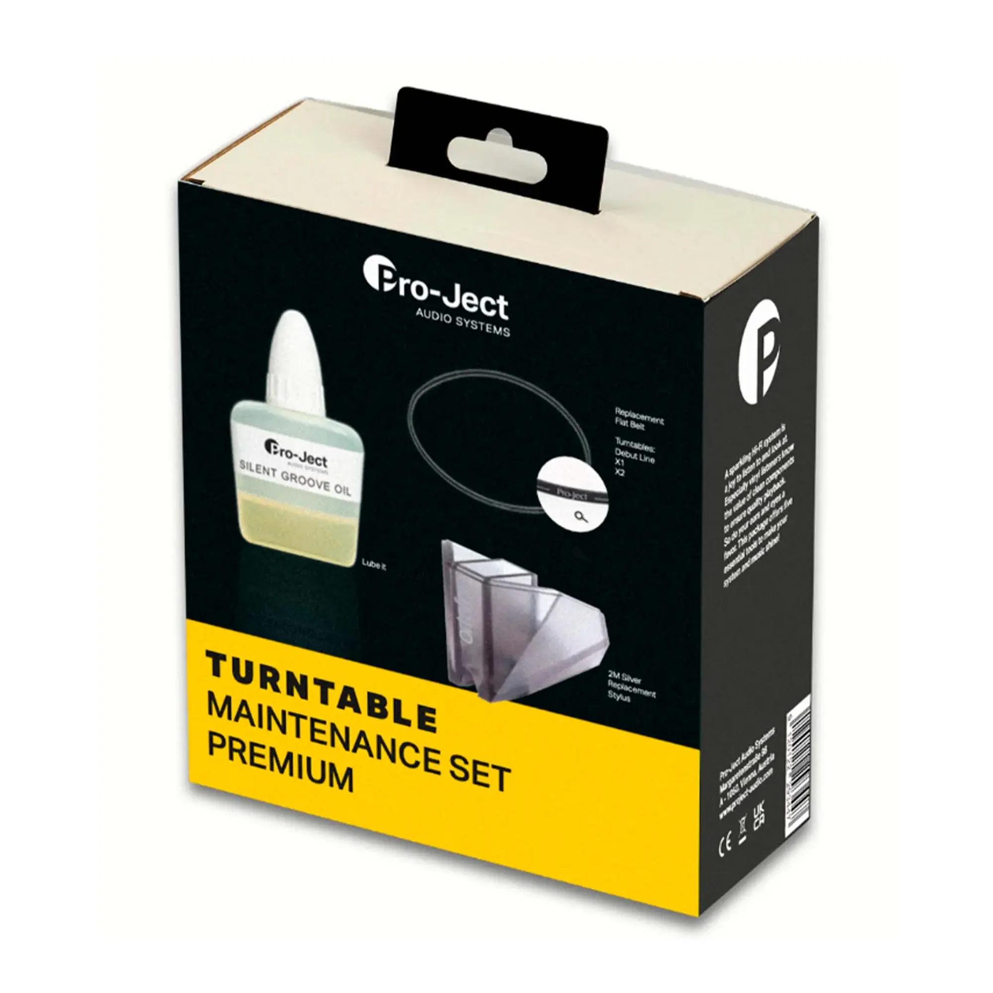 Проигрыватель винила является механическим устройством, нуждающимся в регулярном техническом обслуживании. В набор Pro-Ject Maintenance Set Premium включили аксессуары, которые могут потребоваться для обслуживания проигрывателей серий Debut Carbon, X1 и X2 с картриджами 2M Red, 2M Blue, 2M Silver, Pick It S2 MM, Pick It 2M Silver, Pick It Pro и Pick It Pro B.