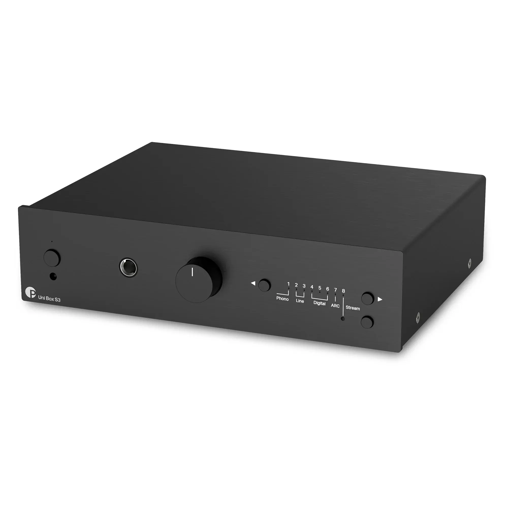 Pro-Ject Uni Box S3 изготавливают в металлическом корпусе с алюминиевой передней панелью. Он служит для защиты схем усилителя от внешних наводок и вибраций, а также придает модели престижный внешний вид.
