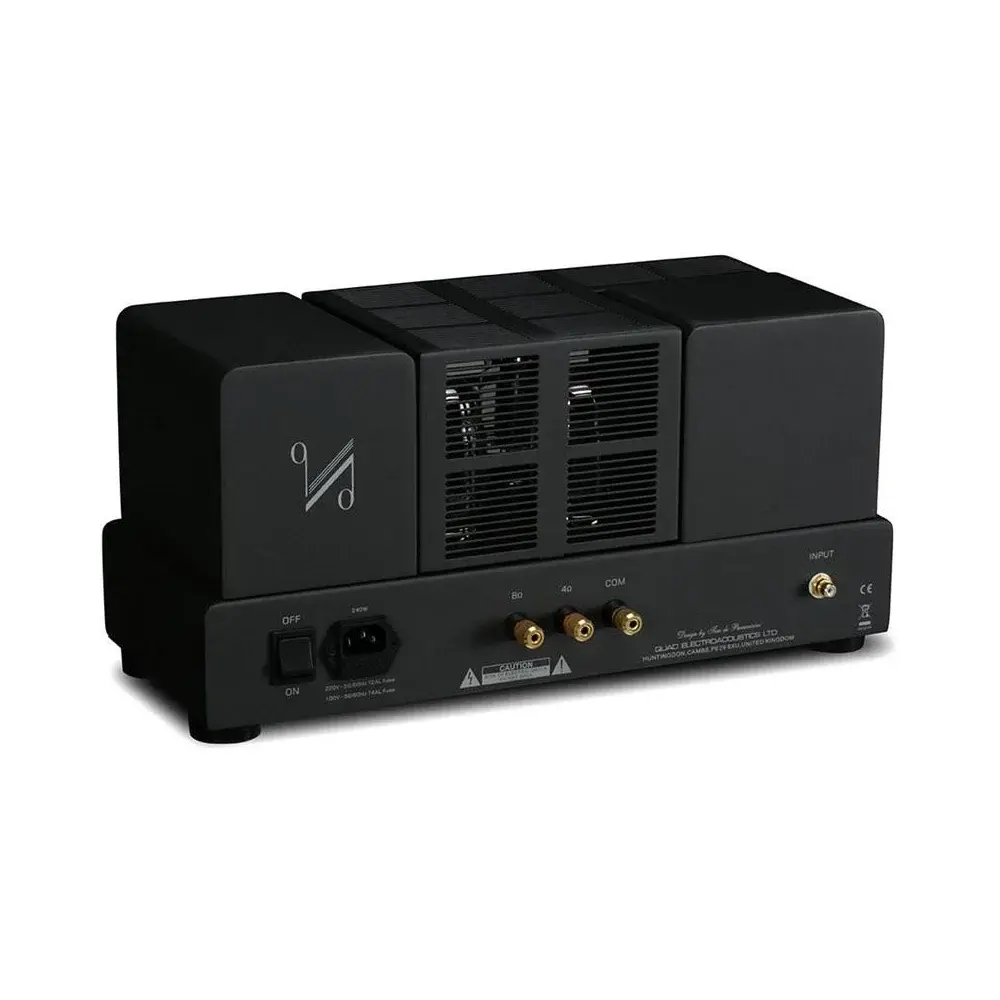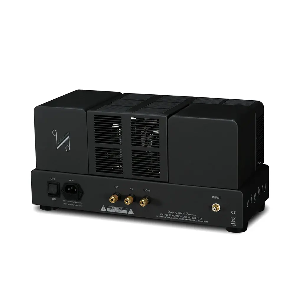 На задней панели корпуса имеется три позолоченных винтовых терминала («минусовая» COM и «плюсовые»), которые поддерживают спикеры с импедансом 4 и 8 Ом. Тут же располагается высококачественный разъём RCA для подсоединения предварительных усилителей. Усилители могут похвастаться работой в широком частотном диапазоне и способностью поддерживать низкоомную нагрузку. При этом моноблоки Quad QII 80 имеют высоконадёжную конструкцию и длительный срок службы.
