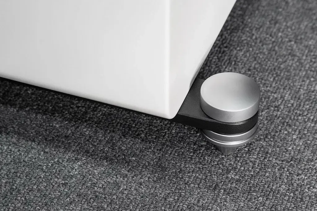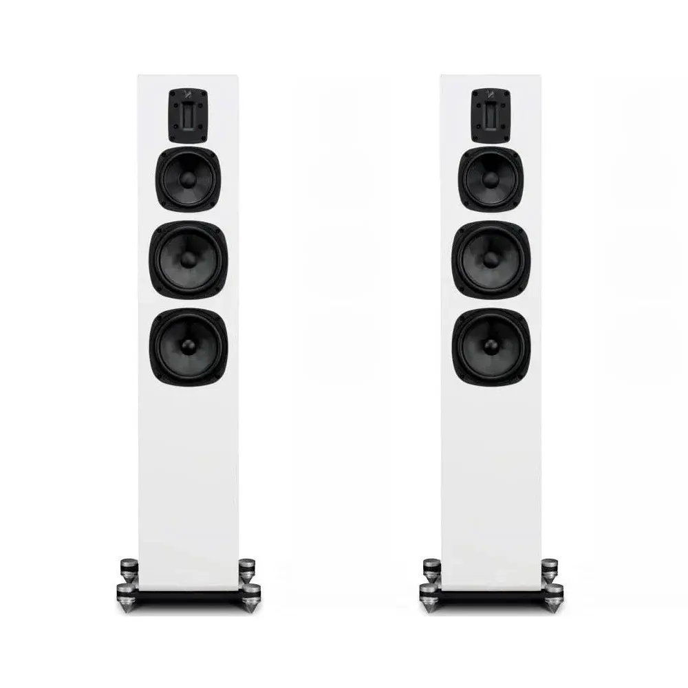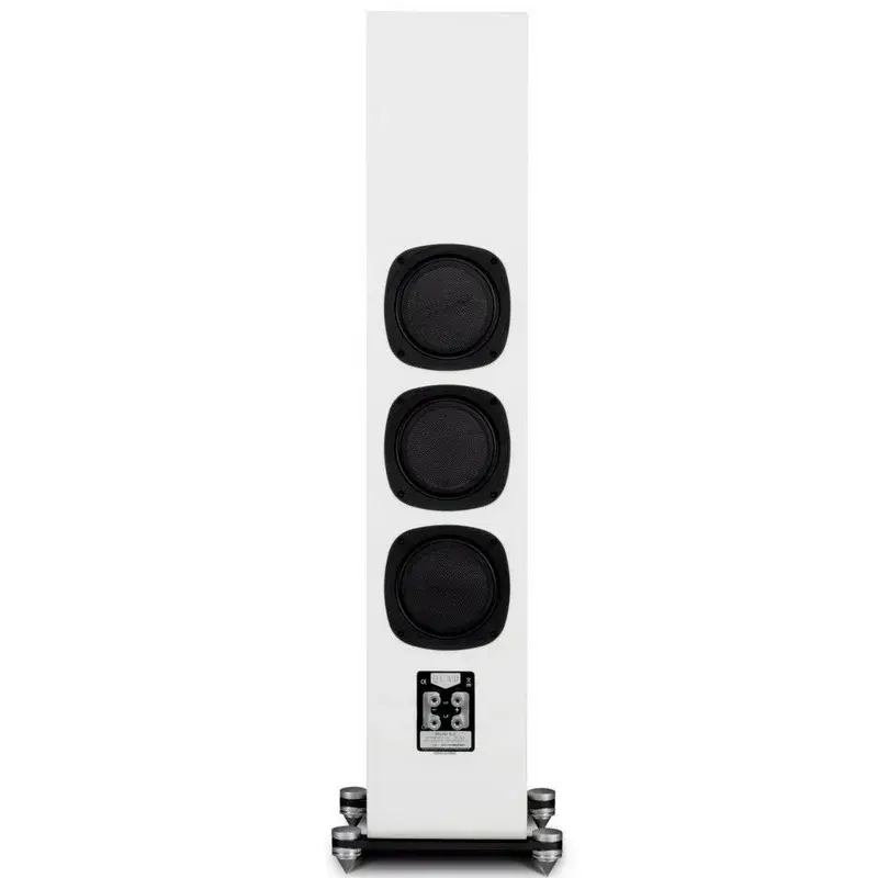 Quad S-5 оснащены фирменным ленточным твитером с размерами 12 х 45 мм, имеющим эффективную магнитную систему и прецизионную конструкцию. Так как данная модель обладает трехполосной конфигурацией, за воспроизведение средних частот здесь отвечает отельный динамик диаметром 125 мм с диффузором из тканного кевлара. Еще два более крупных излучателя с диафрагмами из такого же материала воспроизводят низкие частоты, диапазон которых в Quad S-5 начинается с 42 Гц по уровню – 3 дБ. При этом нагрузкой низкочастотной секции в данной модели являются три пассивных басовых радиатора, расположенных на задней панели.