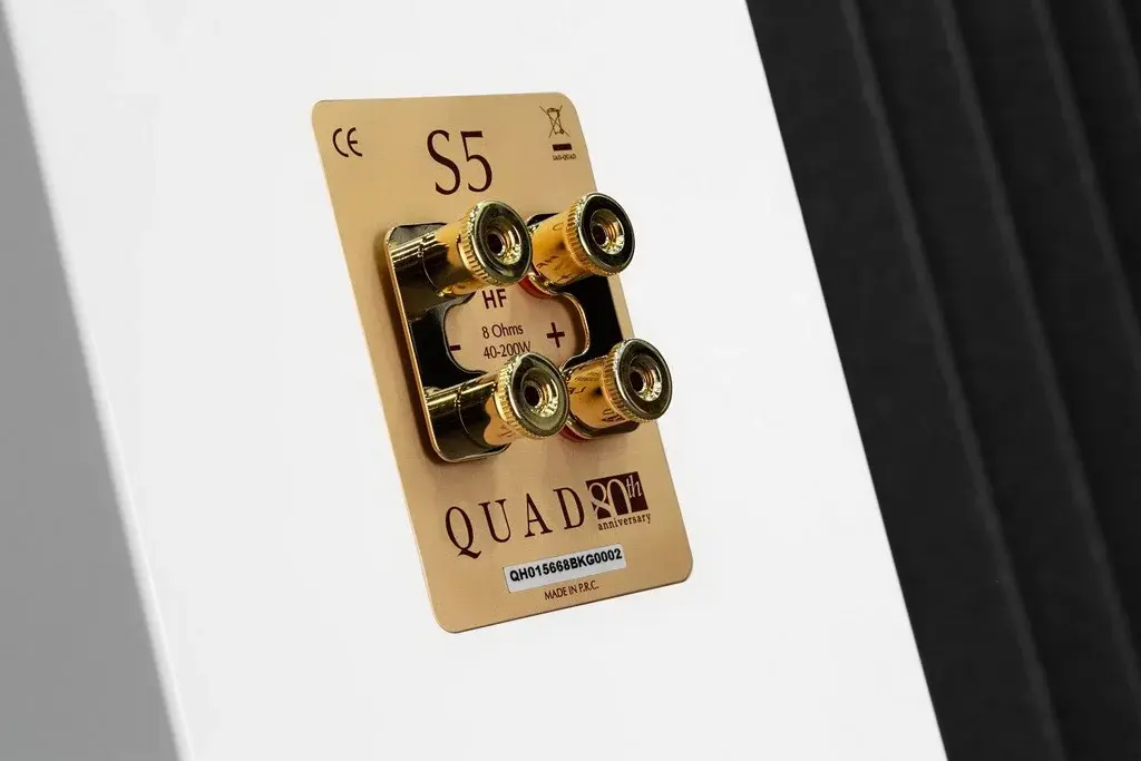 Такое решение имеет ряд преимуществ с точки зрения качества звука, и, кроме того, делает Quad S-5 менее требовательными к выбору места размещения в комнате прослушивания. Для придания колонкам большей устойчивости их опоры вынесены за пределы нижней панели. Для подключения к усилителю в акустике предусмотрен входной блок из двух пар высококлассных винтовых разъемов.