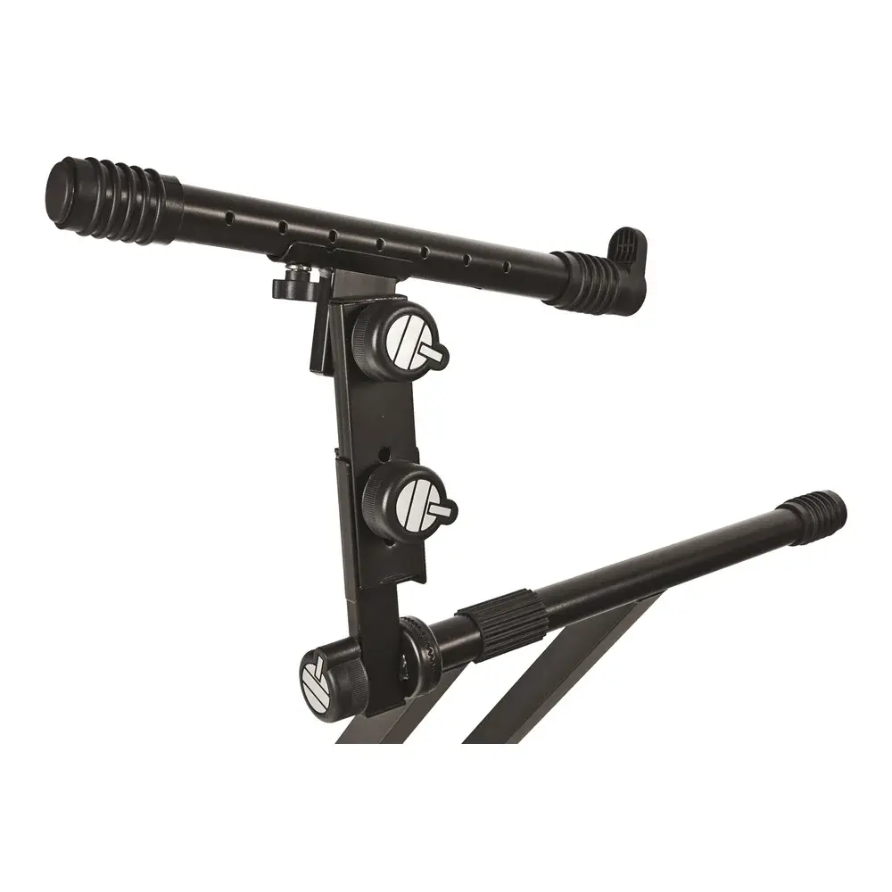 Изготовлена из прочного стального профиля с двойной рамой и усиленным механизмом блокировки. Выдерживает нагрузку до 120 кг, из которых до 33,7 кг может приходиться на верхний ярус. Высота стойки настраивается для исполнения музыки стоя или сидя. Легко складывается для транспортировки или хранения.