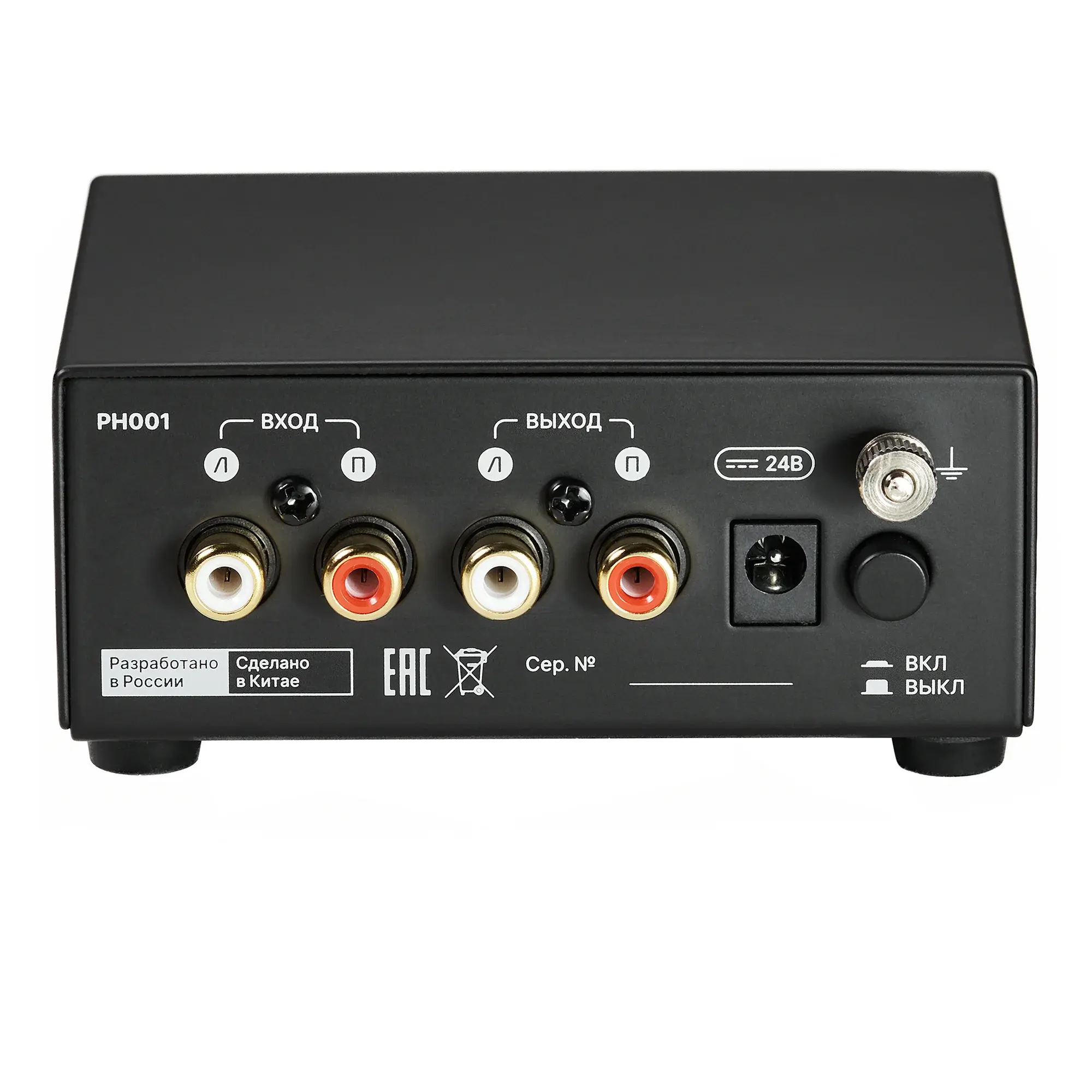 Компактный металлический корпус PH001, окрашенный в черный матовый цвет, гармонично впишется в любую аудиосистему. Его размеры позволяют разместить устройство как рядом с проигрывателем, так и в стойке. Экранированный корпус минимизирует влияние внешних помех, улучшая чистоту звука.