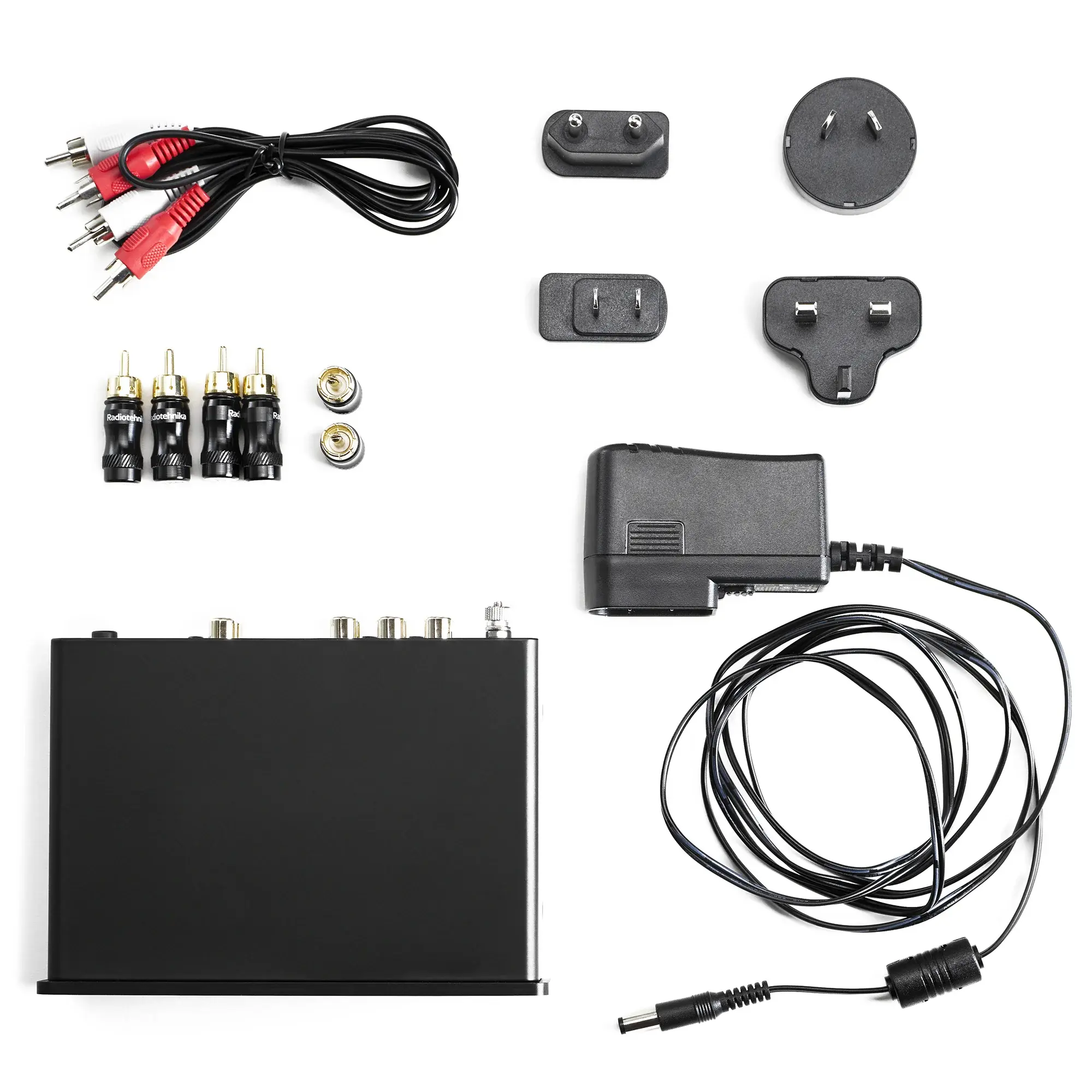 На работу фонокорректора могут негативно влиять электромагнитные наводки, что может привести к искажениям звука. PH002 оснастили внешним сетевым блоком питания, что исключает воздействие его помех на чувствительные электронные схемы устройства. Такой подход используется в высококлассной аудиотехнике. В результате PH002 можно рекомендовать тем, кто ценит чистоту и прозрачность винилового звука. С PH002 вы слышите музыку, а не помехи.