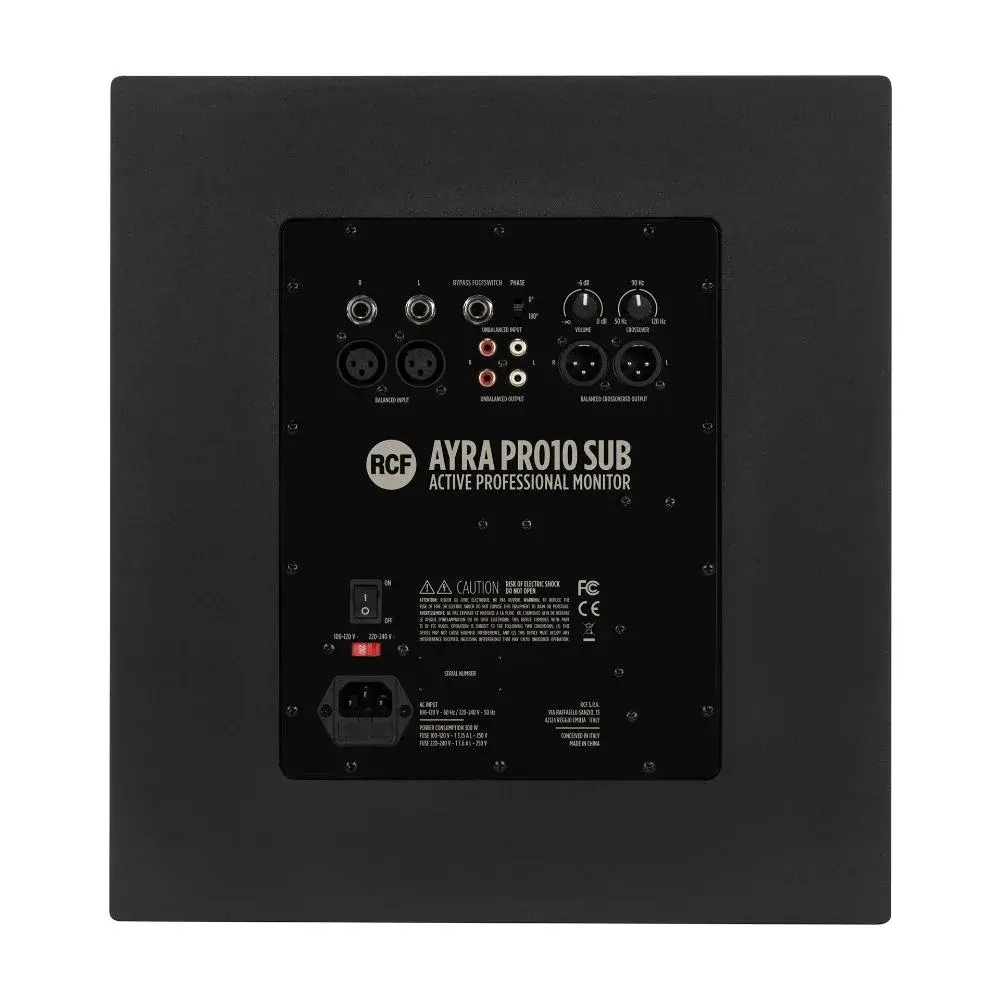 RCF Ayra Pro10 Sub представляет собой активный сабвуфер оснащенный 10-дюймовым композитным динамиком и усилителем D класса на 300 Вт. Из настроек у модели предусмотрен переключатель фазы, регулятор усиления, а также регулятор частоты кроссовера, имеющий диапазон от 50 до 120 Гц. При подключении к сабвуферу педального контроллера возможно отключать звук всей колонки или кроссовера. Диапазон воспроизводимых частот Pro10 Sub составляет 30 – 120 Гц. Для коммутации имеются 2 XLR входа, 2 TRS входа, 2 RCA входа, 2 RCA выхода и 2 XLR выхода.