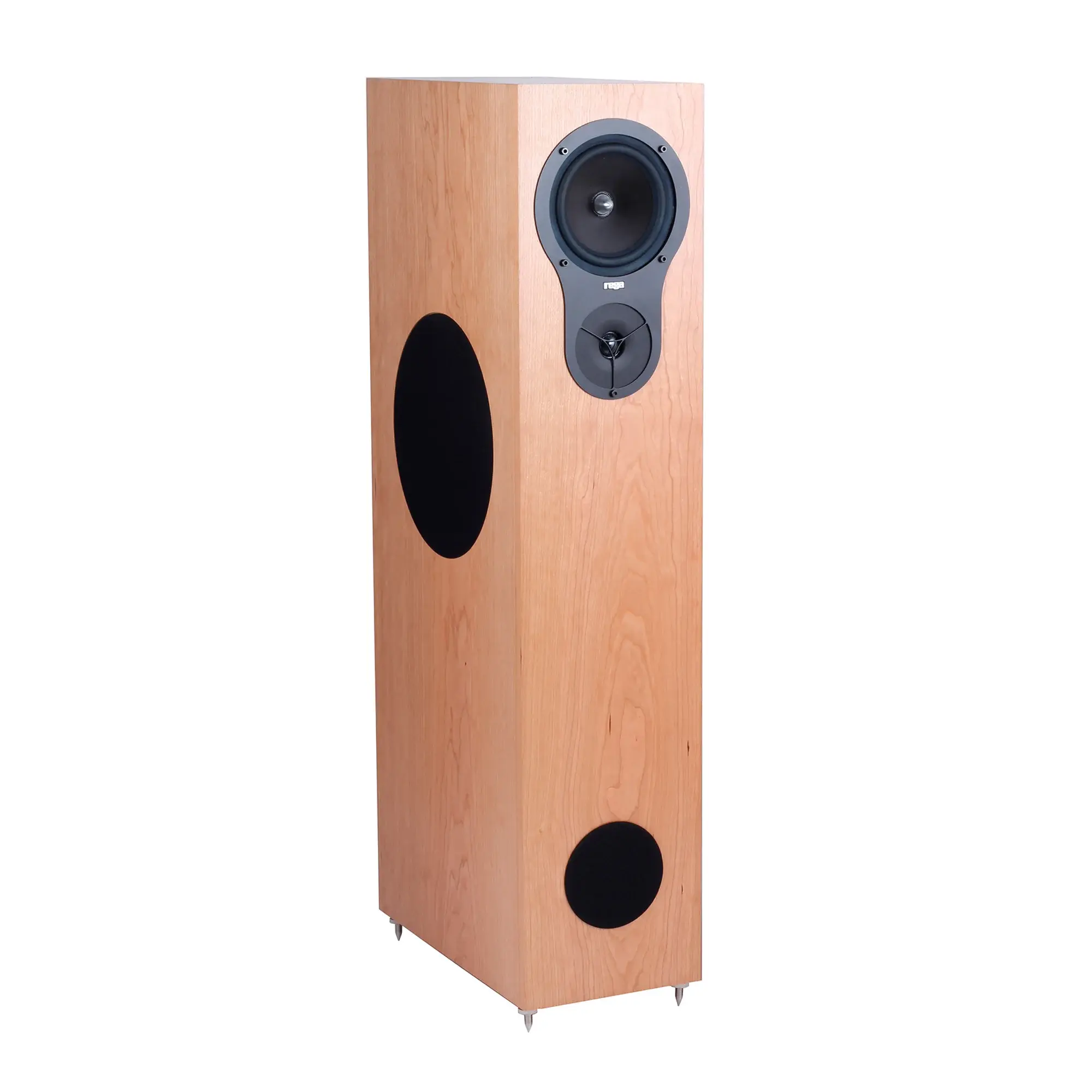 Отлично демпфированный корпус модели отличается достаточно большой глубиной и имеет узкую фронтальную панель, в нижней части которой находится прикрытый материей круглый порт фазоинвертора. В качестве материала здесь задействованы 18-миллиметровые плиты MDF, а отделка выполнена с применением натурального шпона (три вида на выбор: «орех», «вишня» или «черный ясень»). В тылу корпуса находится углубление с двумя качественными винтовыми клеммами. АС комплектуется регулируемыми ножками-шипами.