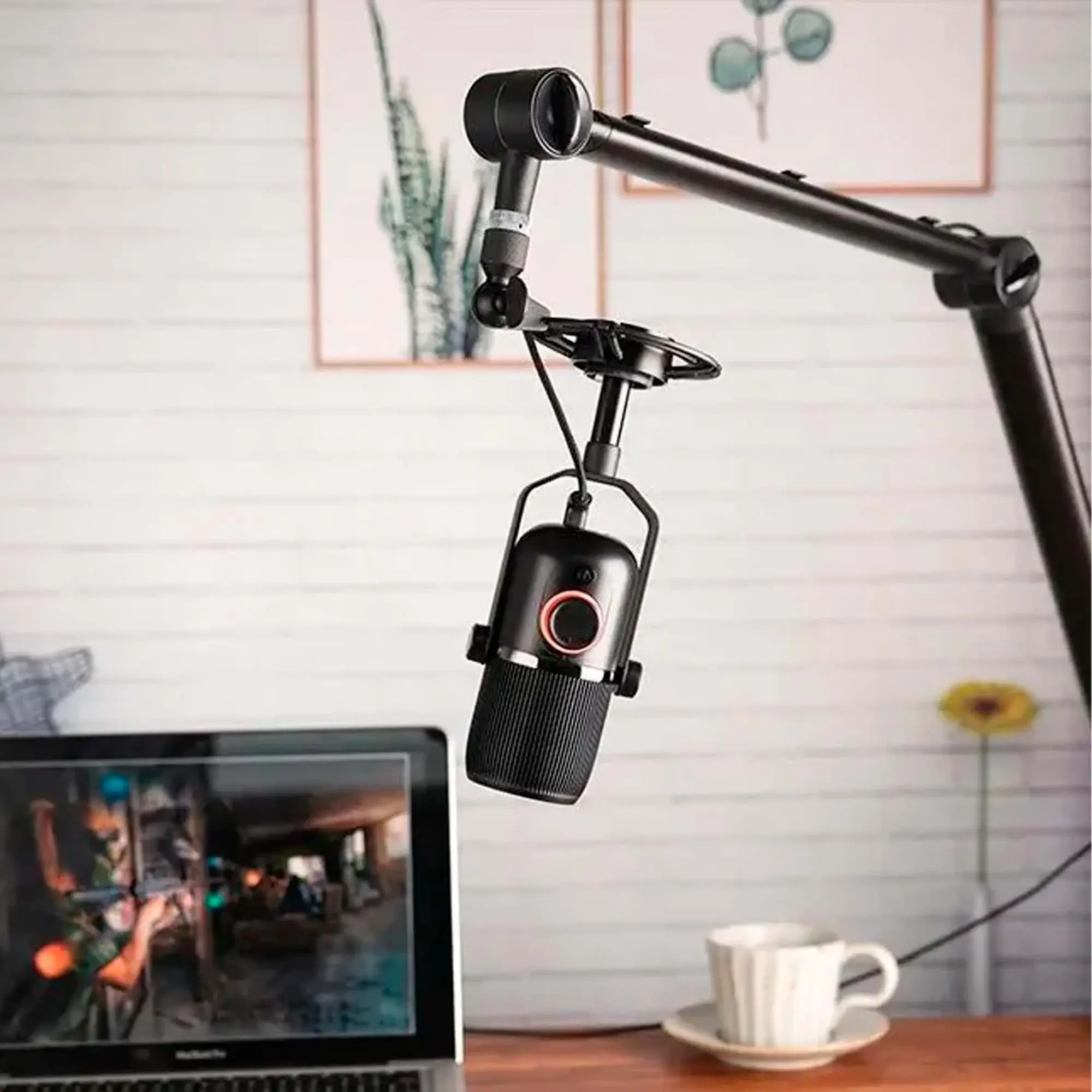 Плечи стойки выполнены из стали и облегченного алюминия. Складная конструкция на занимает много места на столе, не перегораживает обзор, а вместительный кабель канал позволит убрать большинство проводов, высвободив полезное пространство.