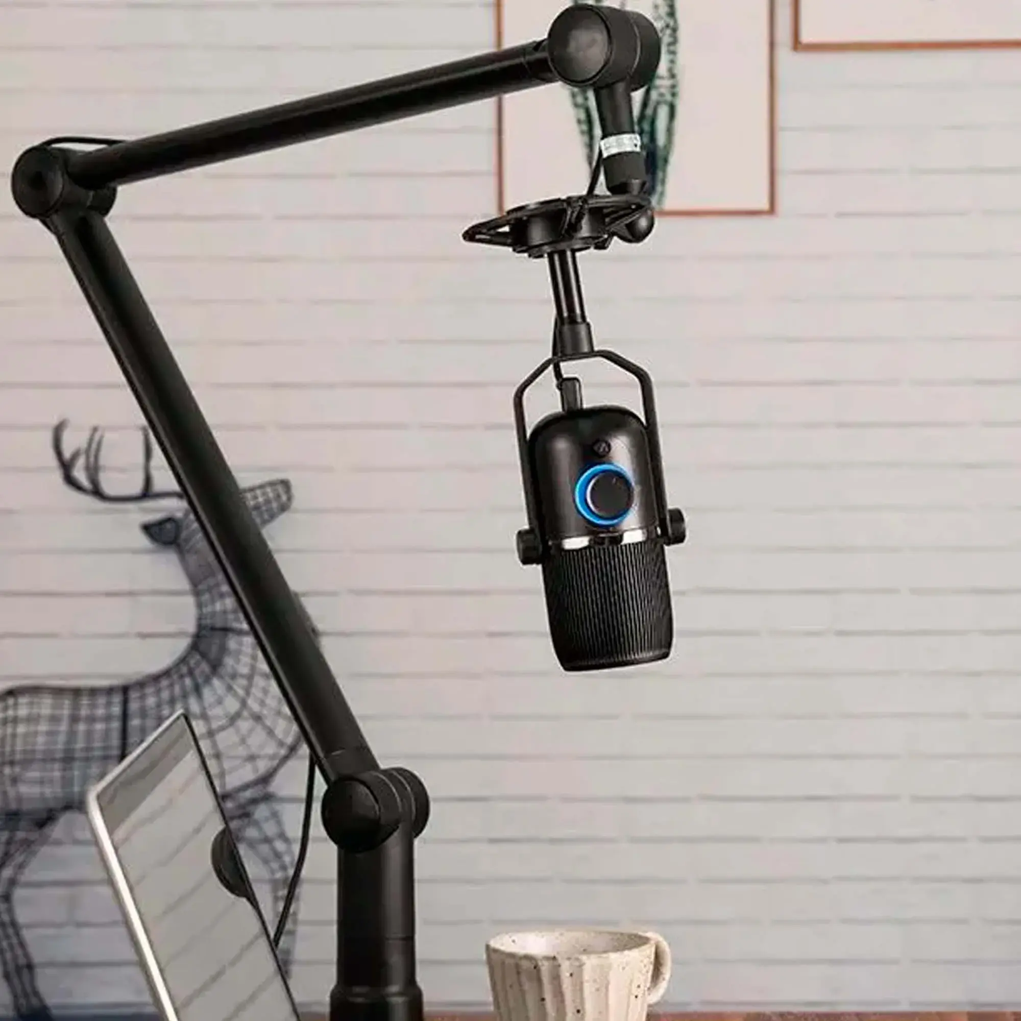 Плечи стойки выполнены из стали и облегченного алюминия. Складная конструкция на занимает много места на столе, не перегораживает обзор, а вместительный кабель канал позволит убрать большинство проводов, высвободив полезное пространство.