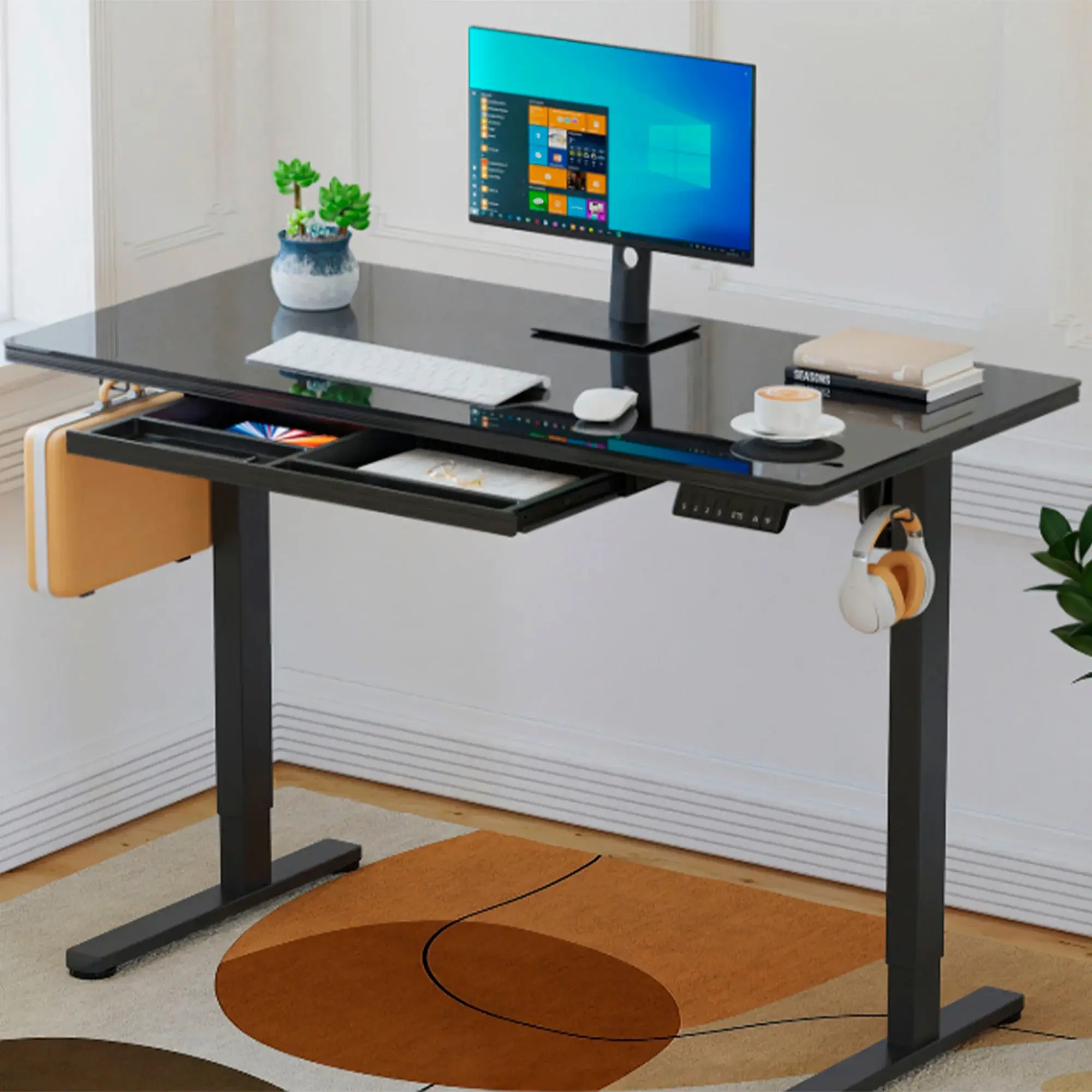 материал: закаленное стекло и МДФ (столешница), металл (рама и ножки), пластик (ящик, корпус управляющего элемента).