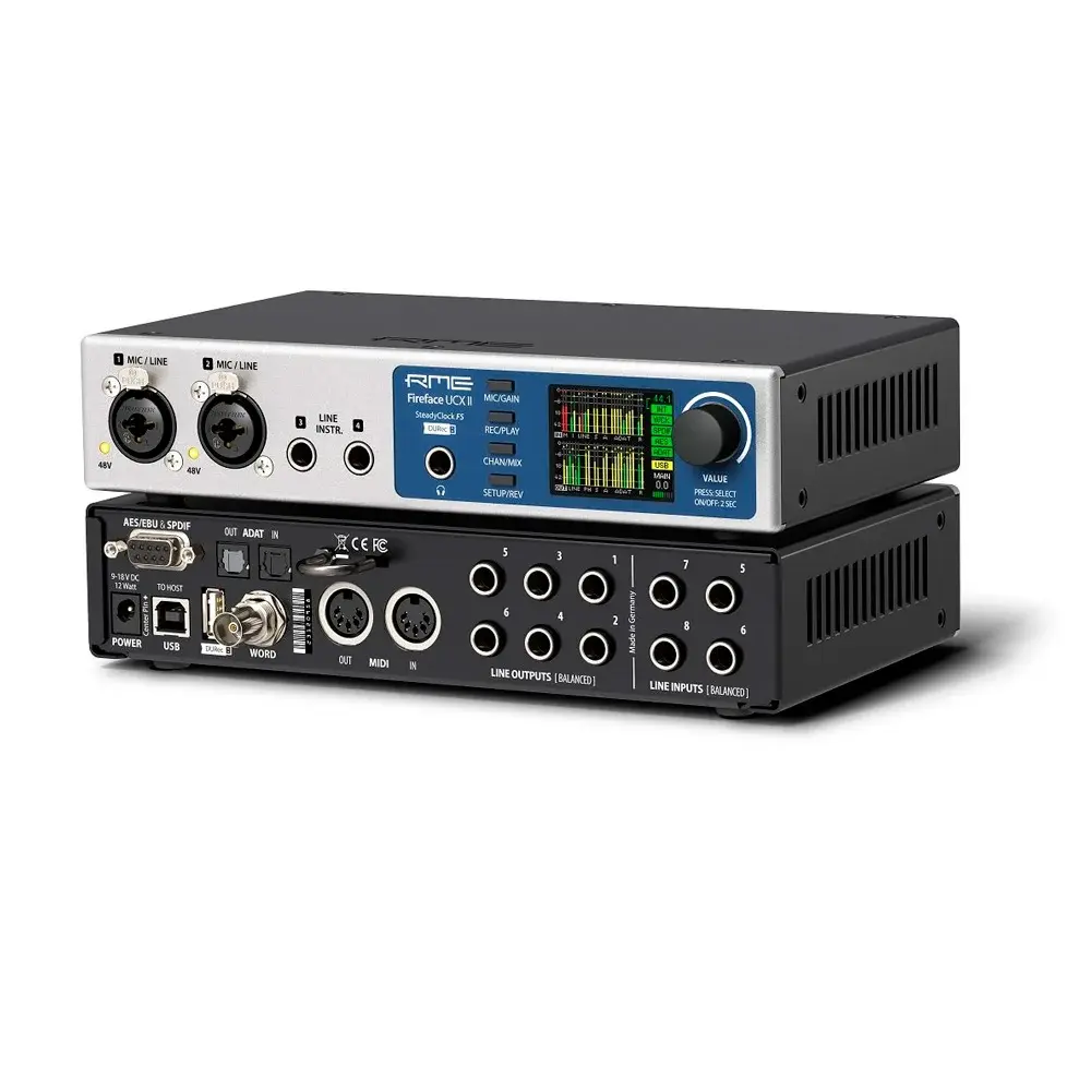 RME Fireface UCX II — USB-аудиоинтерфейс с 40 каналами ввода / вывода, функцией автономной записи на USB-носитель, технологией подавление фазовых и частотных отклонений сигнала SteadyClock FS, дистанционной маршрутизацией и мониторингом через приложение TotalMix FX DSP и анализатором цифрового потока DIGICheck Analyzer.