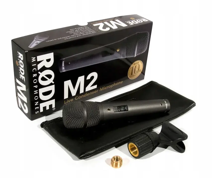 Концертный конденсаторный микрофон, создан на базе получившей много наград и собравшей многочисленные лестные отзывы модели S1. Микрофон M2 ориентирован в первую очередь на вокал, однако благодаря высокой гибкости может быть использован и для других нужд. В техническом описании нового RODE M2 упоминается суперкардиоидный пикап- паттерн, рабочая частота от 35 Гц до 20 кГц, мощность 48V, миниатюрная диафрагма, градиент давления, цельное основание, низкий уровень побочных шумов и качественное поглощение помех, защита от радиопомех и тумблер включения с фиксатором. Как уже упоминалось, микрофон обладает цельнометаллическим массивным корпусом, что значительно повышает его износостойкость. Надежность девайса подтверждается официальной 10-летней гарантией, которую можно получить, купив микрофон и зарегистрировавшись на сайте производителя. В комплекте с микрофоном вы получите крепление на стойку RM1 и чехол ZP1.