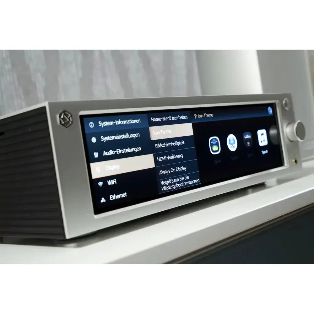 Rose RS250 - сетевой проигрыватель и видеопроигрыватель 4к. 8,8-дюймовая широкоугольная сенсорная панель, занимающая практически всю лицевую сторону. За ее работу отвечает графический процессор Mali-T864, управление всей системой под фирменной Rose OS осуществляет 6-ядерный процессор Cortex.