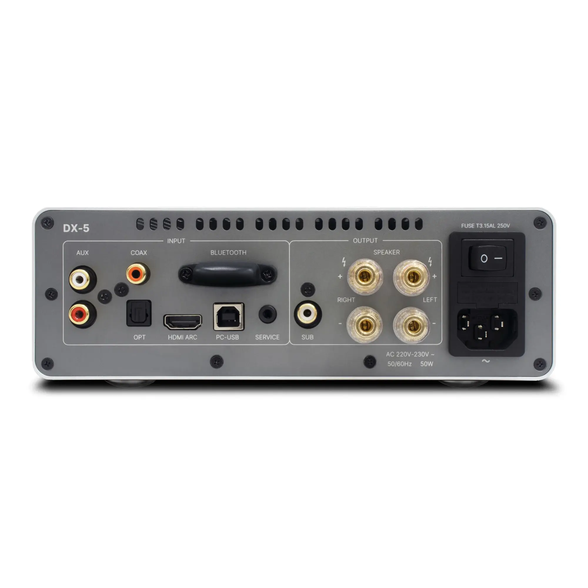 DX-5 поддерживает широкий выбор источников, включая PC-USB с поддержкой PCM до 32 бит/384 кГц и DSD 4x (с поддержкой DoP), коаксиальные и оптические цифровые входы (до 24 бит/192 кГц), а также Bluetooth aptXTM HD и AAC для беспроводной передачи аудио в высоком разрешении. Аналоговый вход RCA обеспечивает подключение ко всем устаревшим источникам, таким как CD-плееры и проигрыватели винила с линейными выходами.