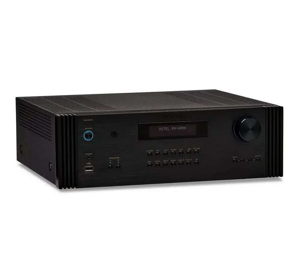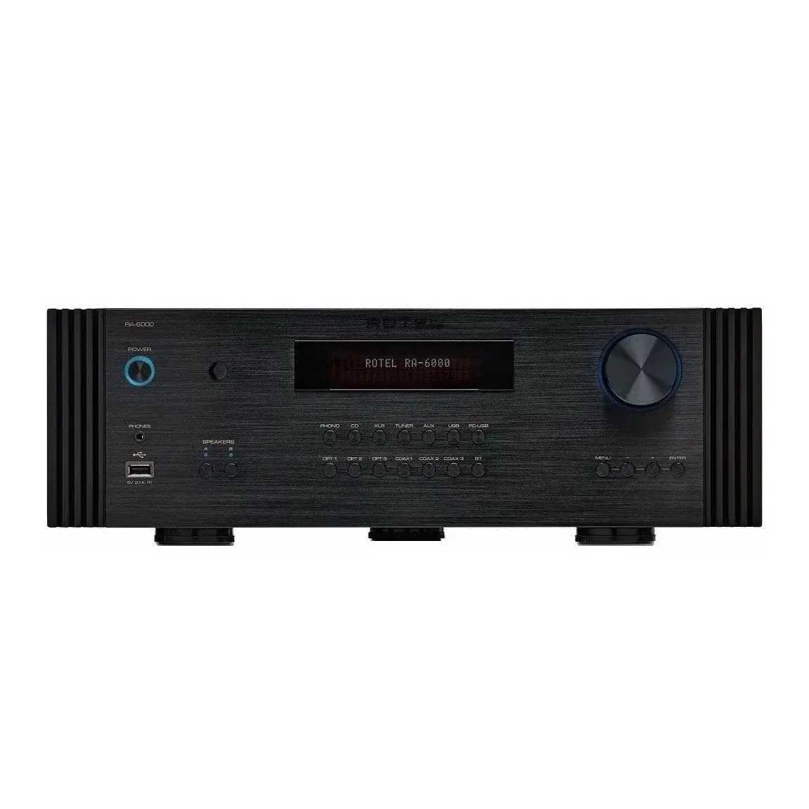 В блоке питания Rotel RA-6000 установлен крупный фирменный тороидальный трансформатор и набор заказных фольговых конденсаторов с перфорированными обкладками. Усилитель обладает мощностью в 200 Вт на канал при 8 Ом и в 350 Вт при четырехомной нагрузке. В усилителе Rotel RA-6000 задействован ЦАП Texas Instruments, который поддерживает форматы PCM до 32 бит/384 кГц и MQA при использовании асинхронного USB-входа. На борту также имеется Bluetooth-модуль с поддержкой аудиокодеков aptX и AAC. «Интегральник» получил сертификат Roon Tested и может работать с программным обеспечением Roon. Усилитель собран в металлическом корпусе и имеет хорошо читаемый двухстрочный дисплей, установленный в центре фронтальной панели. Для управления Rotel RA-6000 служит штатный пульт ДУ.